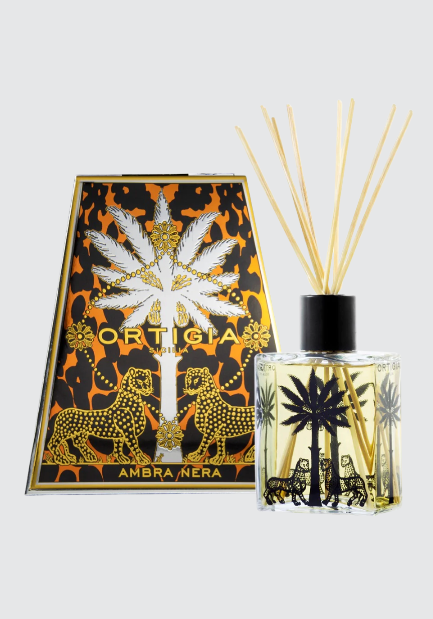 Beskrivelse: Ambra Nera Diffuser 200ML Palma fra Oritiga Sicilia. Skap en varm og sofistikert atmosfære med Ambra Nera duftpinner. Den elegante signaturflasken rommer 200 ml duftvæske som, gjennom naturlige pinner, sprer en subtil og kontinuerlig duft av muskaktig amber og krydder. Perfekt til både stue, soverom og entré.