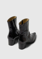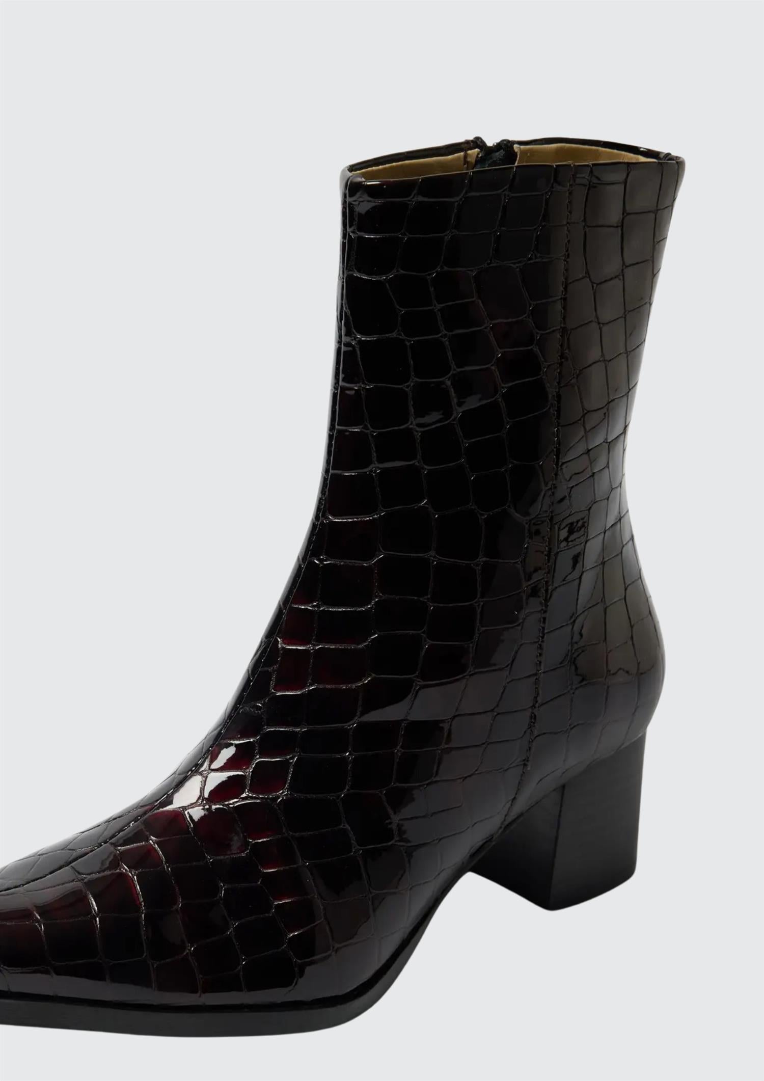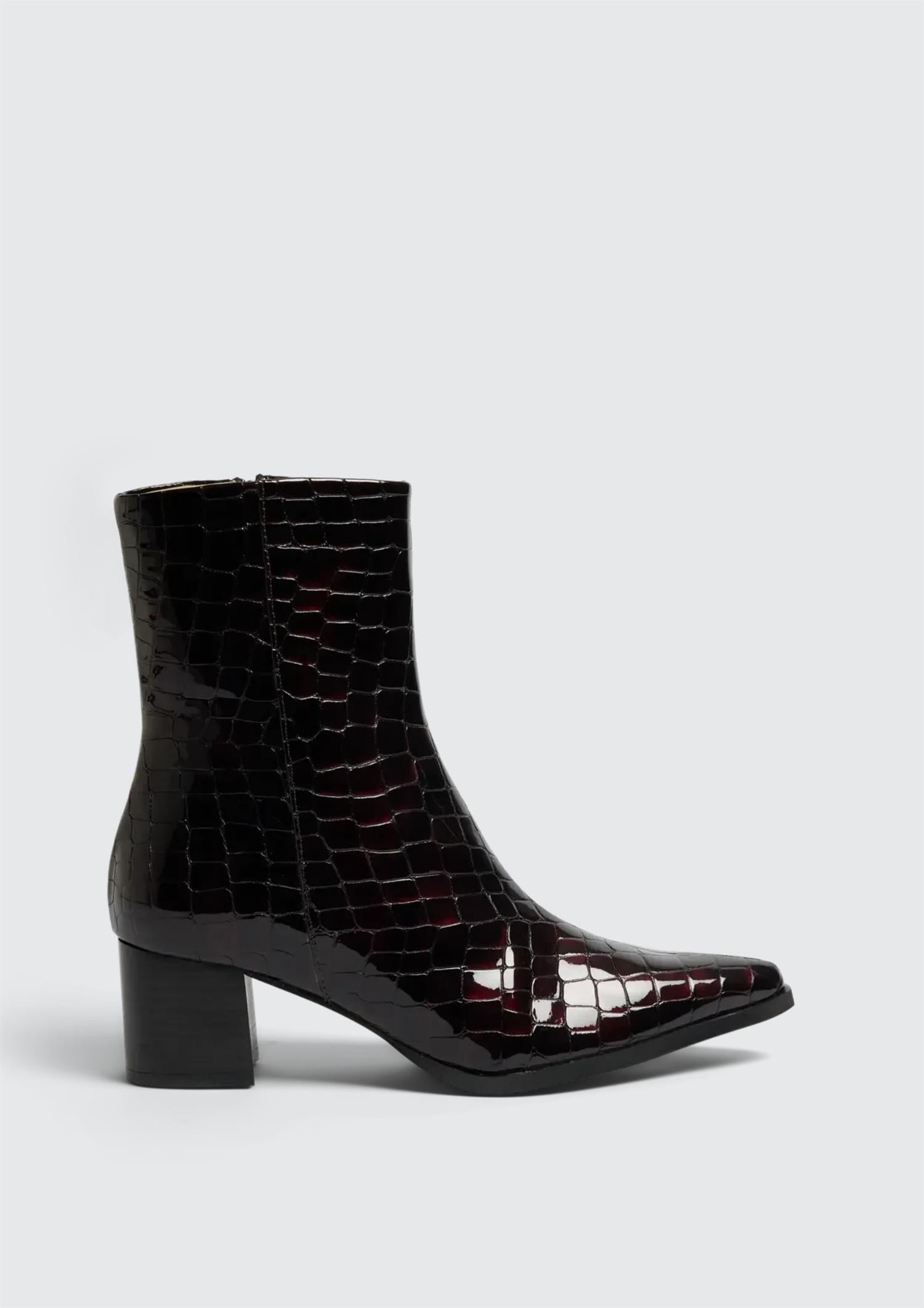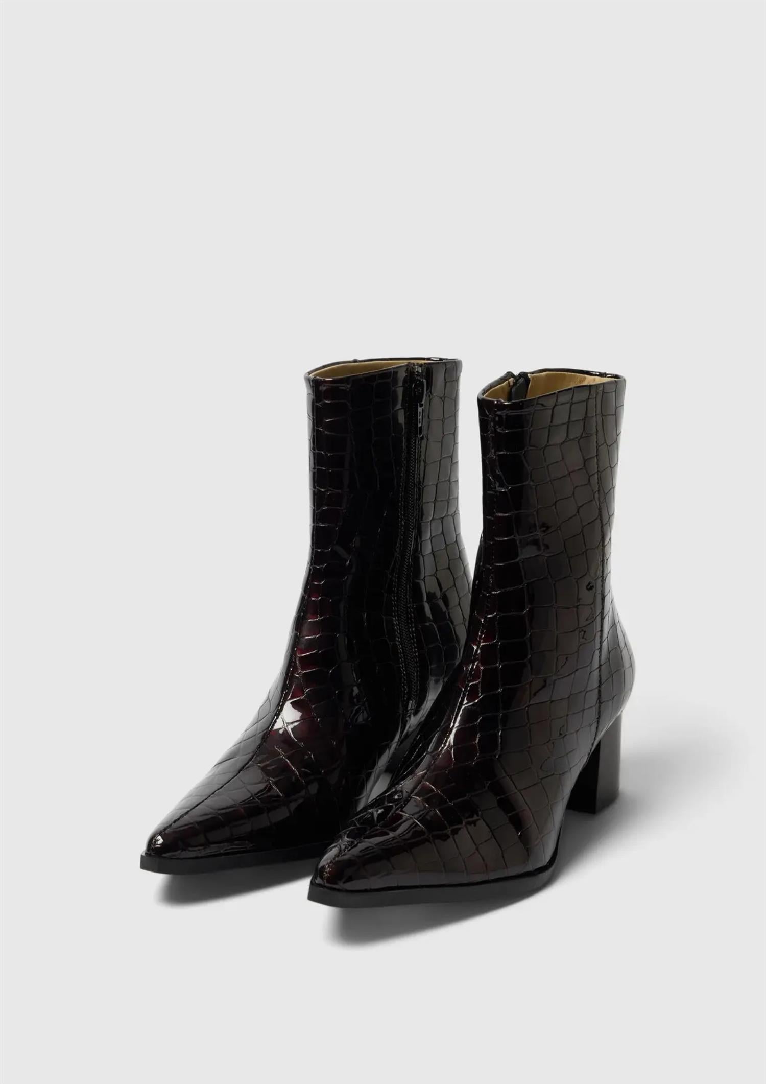 BESKRIVELSE: Stine Leather Boot fra Selected Femme. Moderne ankelboots i et tidløst design. Stine Leather Boot er laget i burgunder croco skinn med spiss tå og mellomhøyt skaft med glidelås på innsiden. Bootsene har stødig blokkhæl som gjør de komfortable på foten gjennom hele dagen.