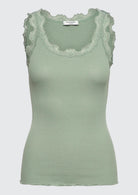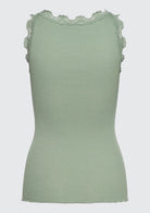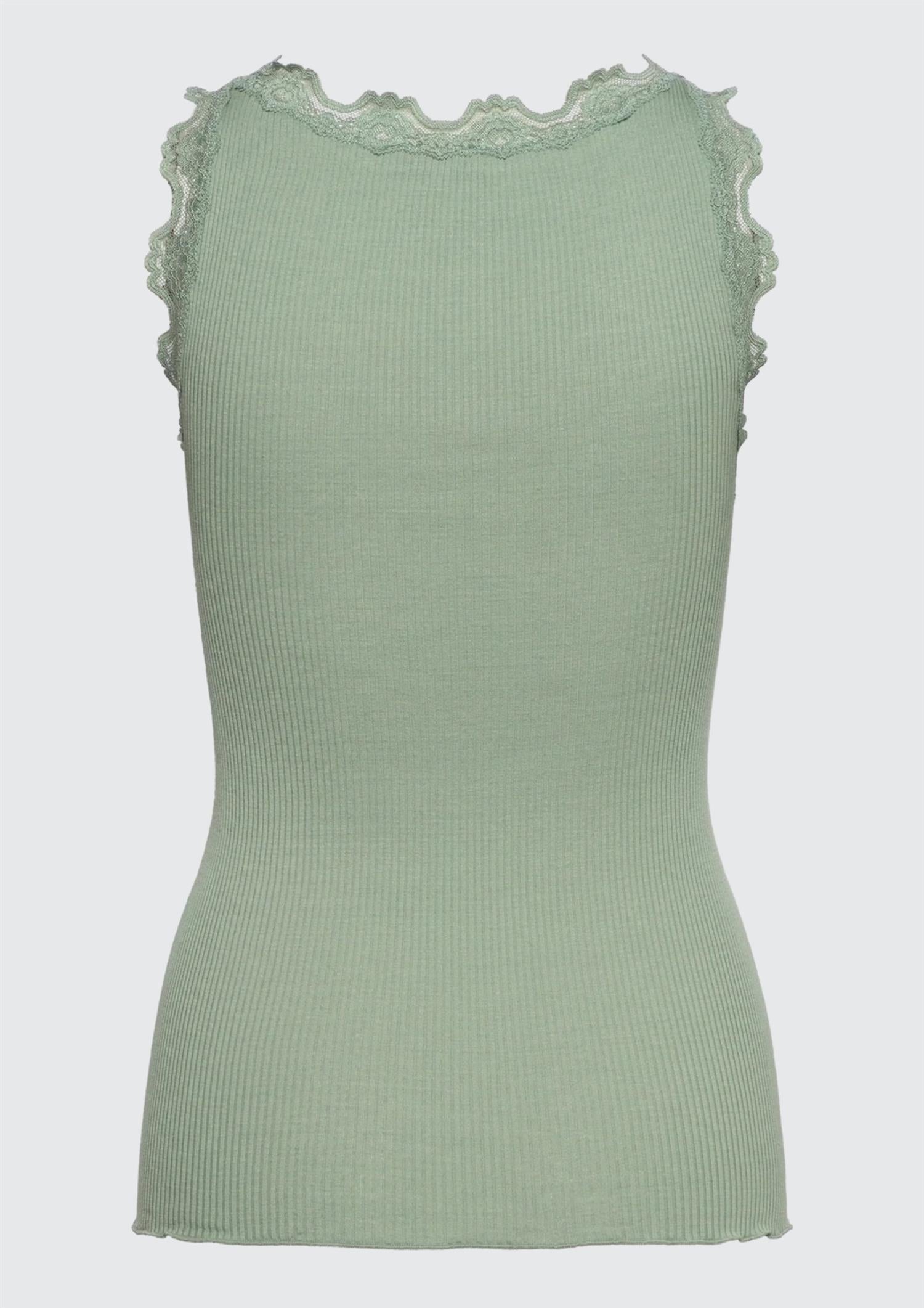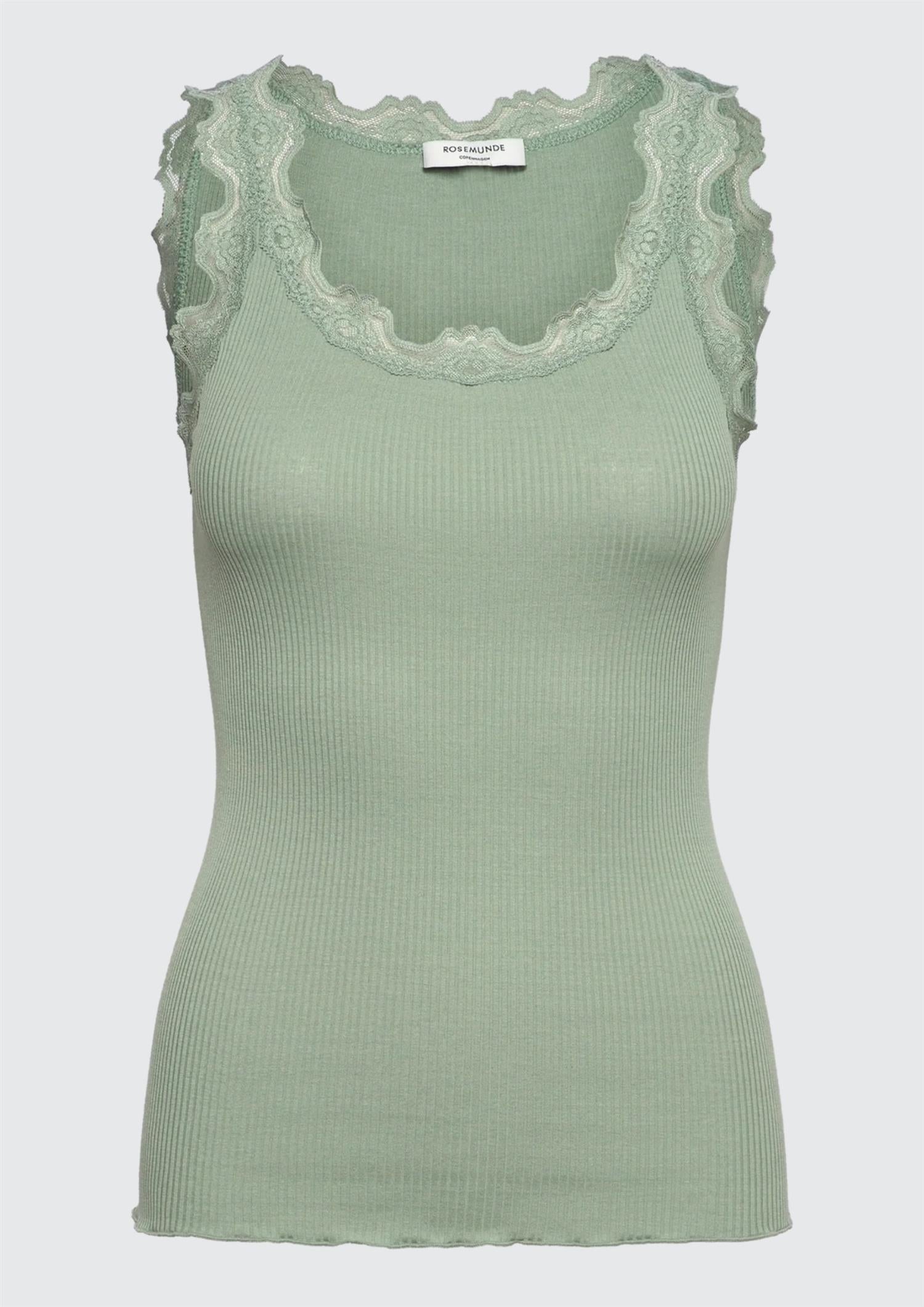 Beskrivelse: Silketopp fra Rosemunde med blondekant. Ribbet materiale. Passformen er tettsittende og den er perfekt å ha under bluser og gensere, eller som kun en søt topp.