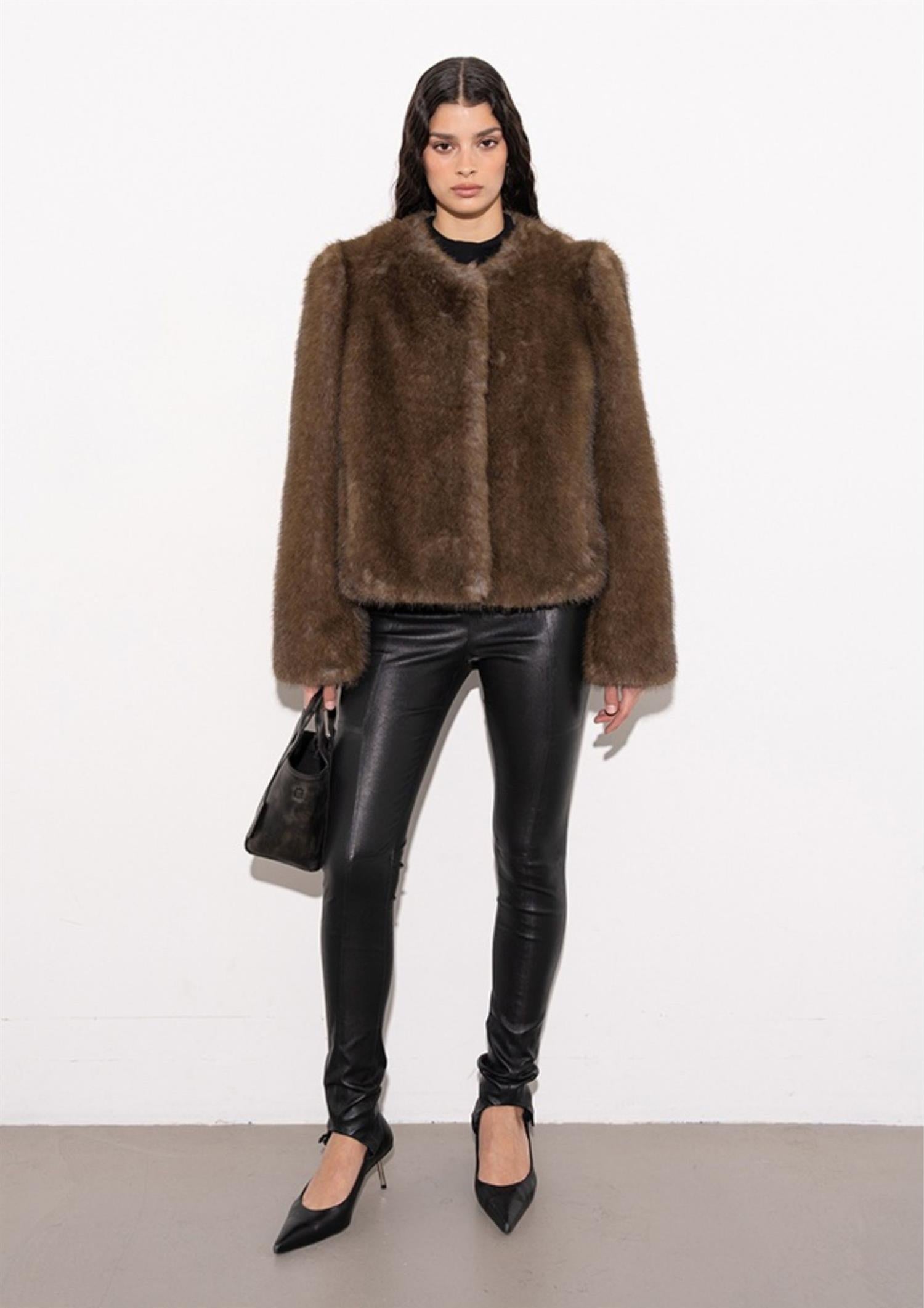 BESKRIVELSE: En helt rå faux fur jakke fra Stand Studio. Jakken har hekter på innsiden til lukking, skulderputer og lommer i siden.
