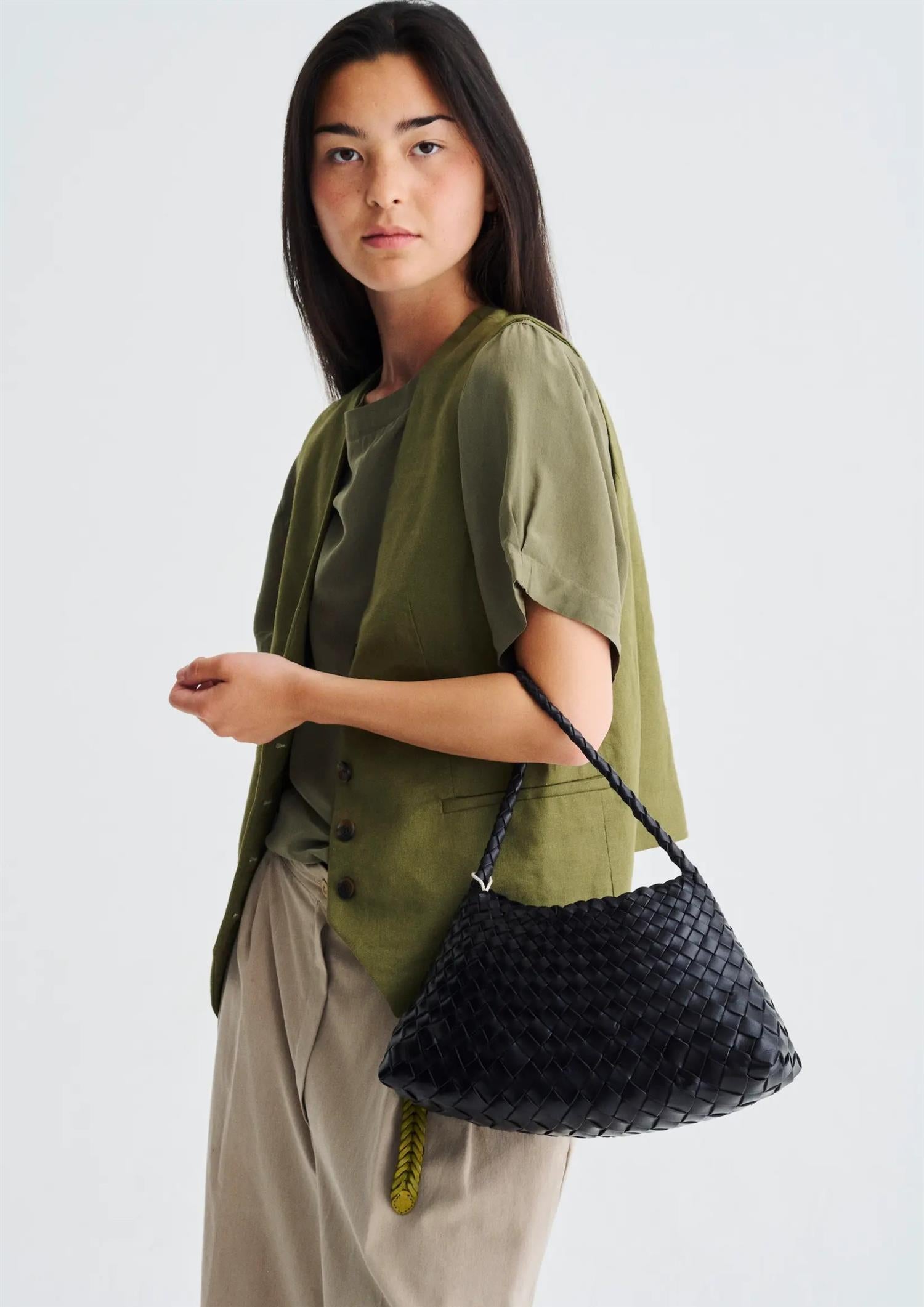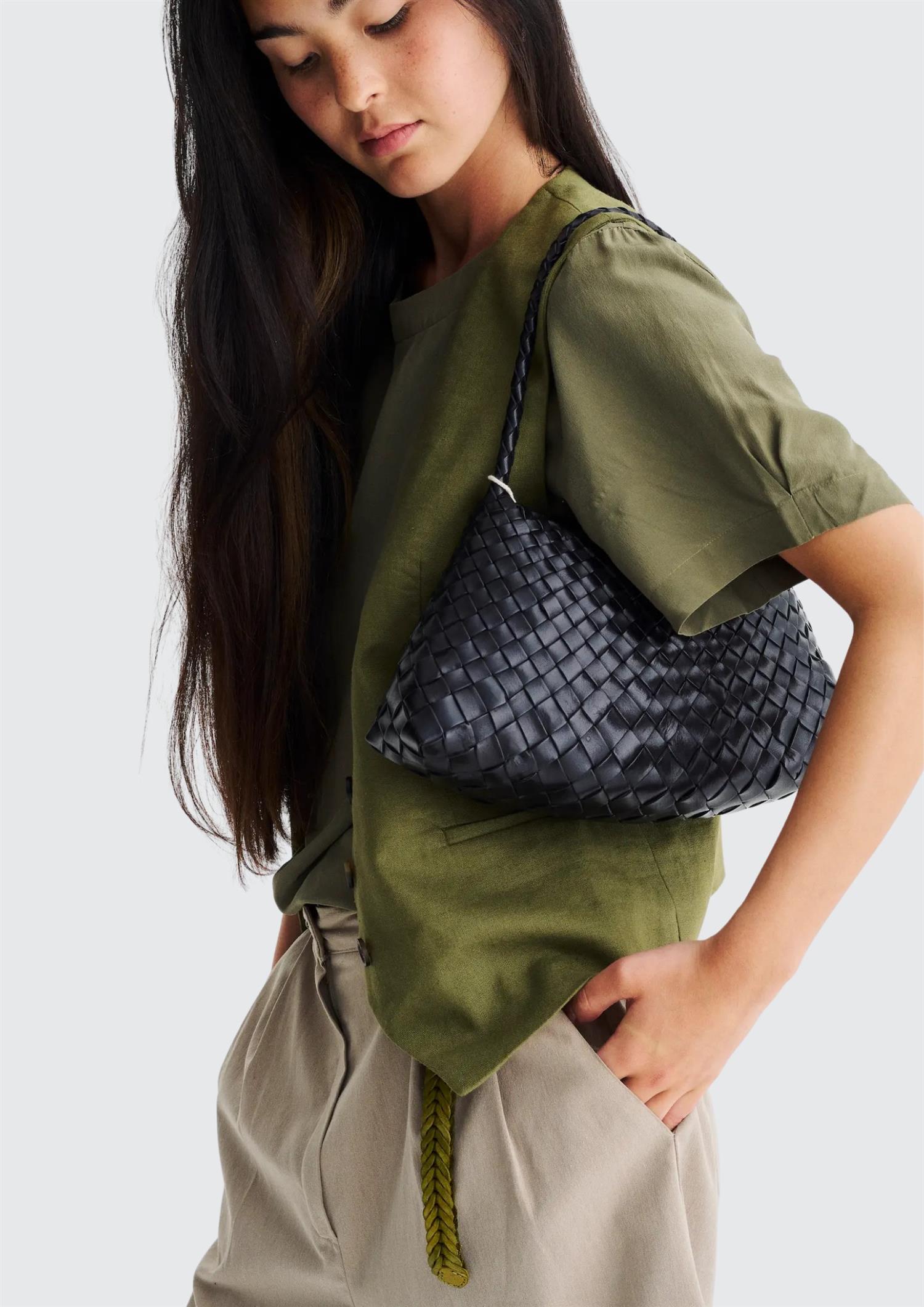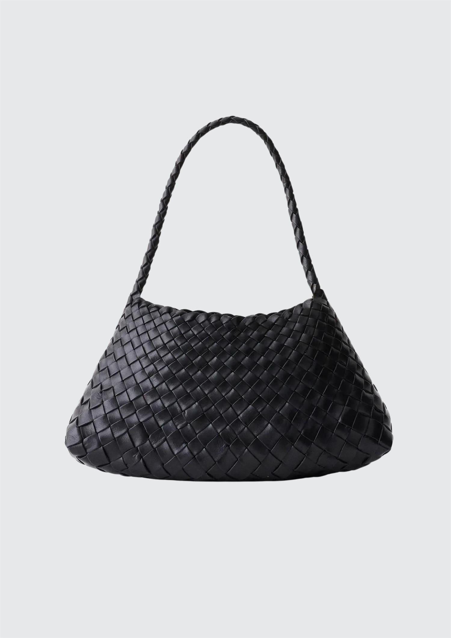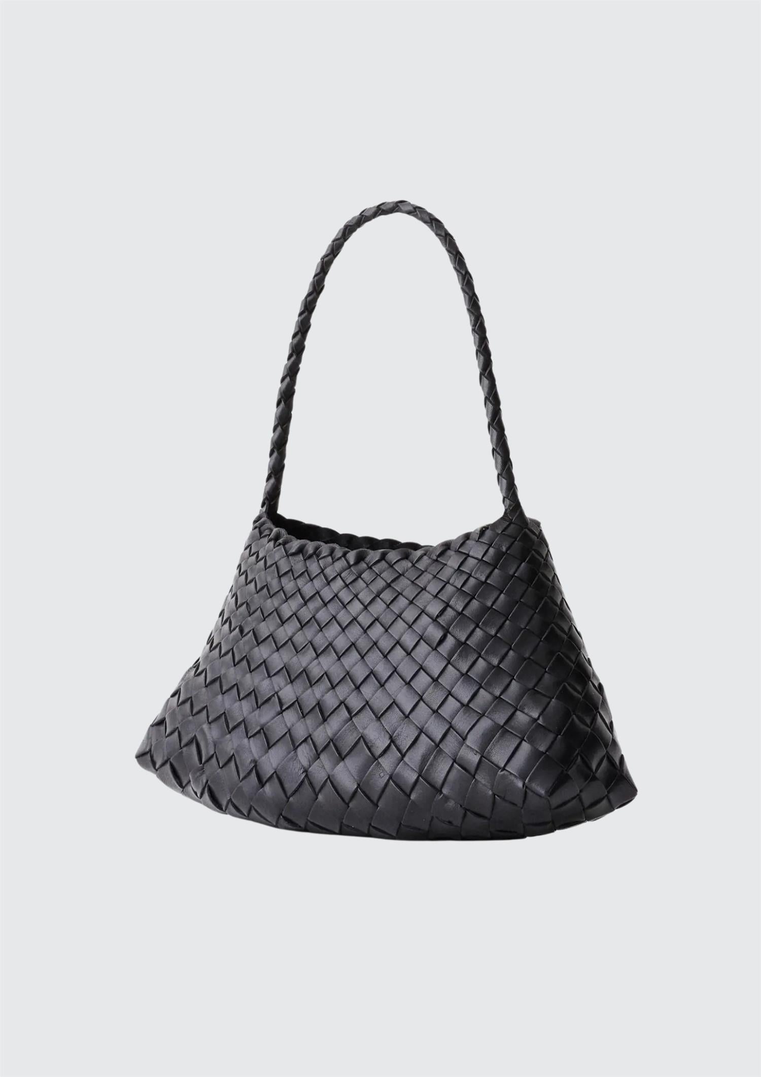 BESKRIVELSE: Rosanna fra Dragon Diffusion er en håndlaget skulderveske i brunt vevd lær med en elegant, avrundet form som smalner mot toppen. Den minimalistiske designen gjør vesken til et tidløst valg – perfekt både til hverdags og reiser. Vesken er uten fôr og har åpen topp, noe som gir et naturlig og autentisk preg. Hvert eksemplar bærer en antikk St. Christopher-medaljong som merke på ekthet og kvalitet.
