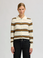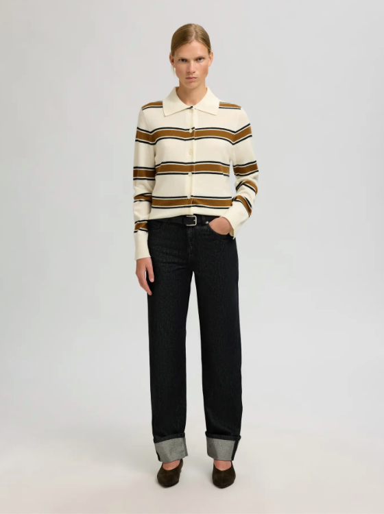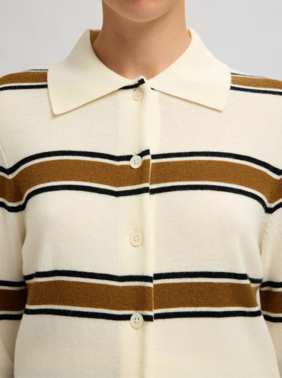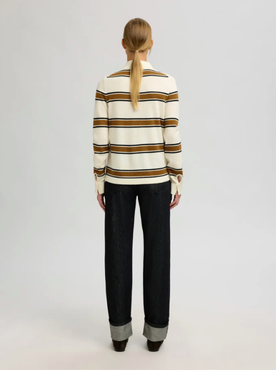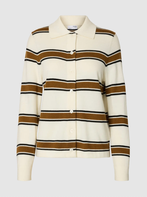 BESKRIVELSE: Thea Ls Knit Button Collar Neck fra Selected Femme. En elegant strikkegenser i kremhvit base med brede kontraststriper i brunt og svart. Designet har klassisk krage, knappelukking foran og en rett, lett innsvinget passform som gir et sofistikert uttrykk. Thea Ls Knit Button Collar Neck kombinerer retro-inspirert design med moderne komfort.