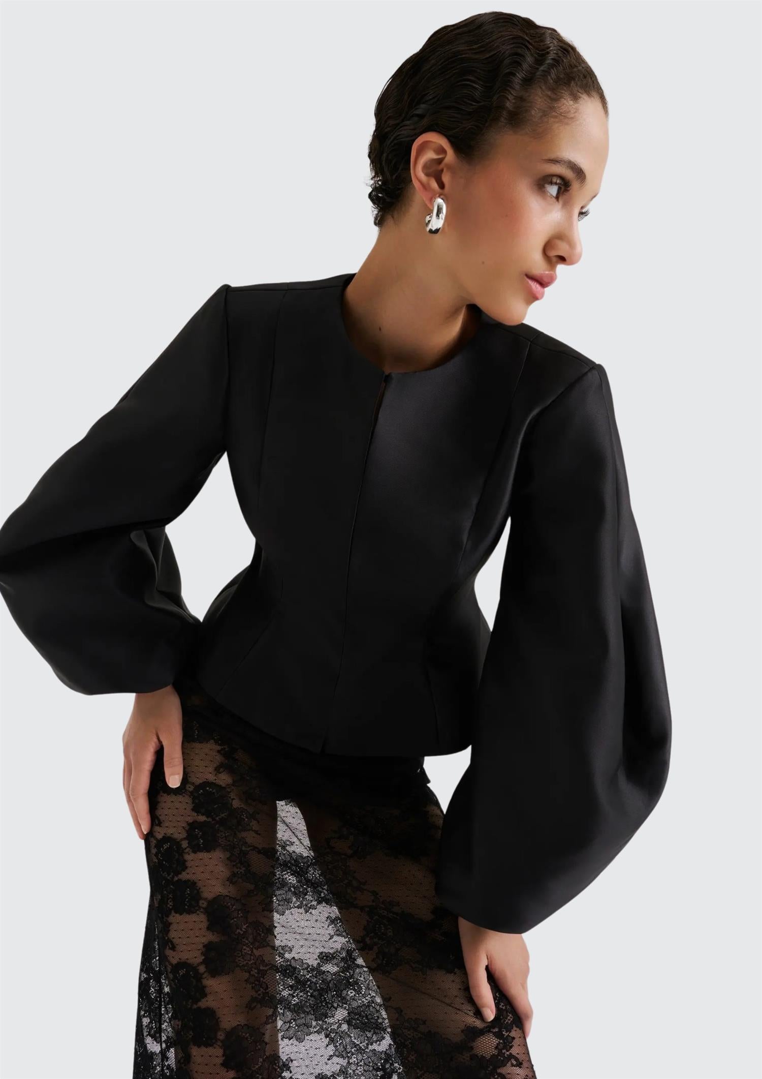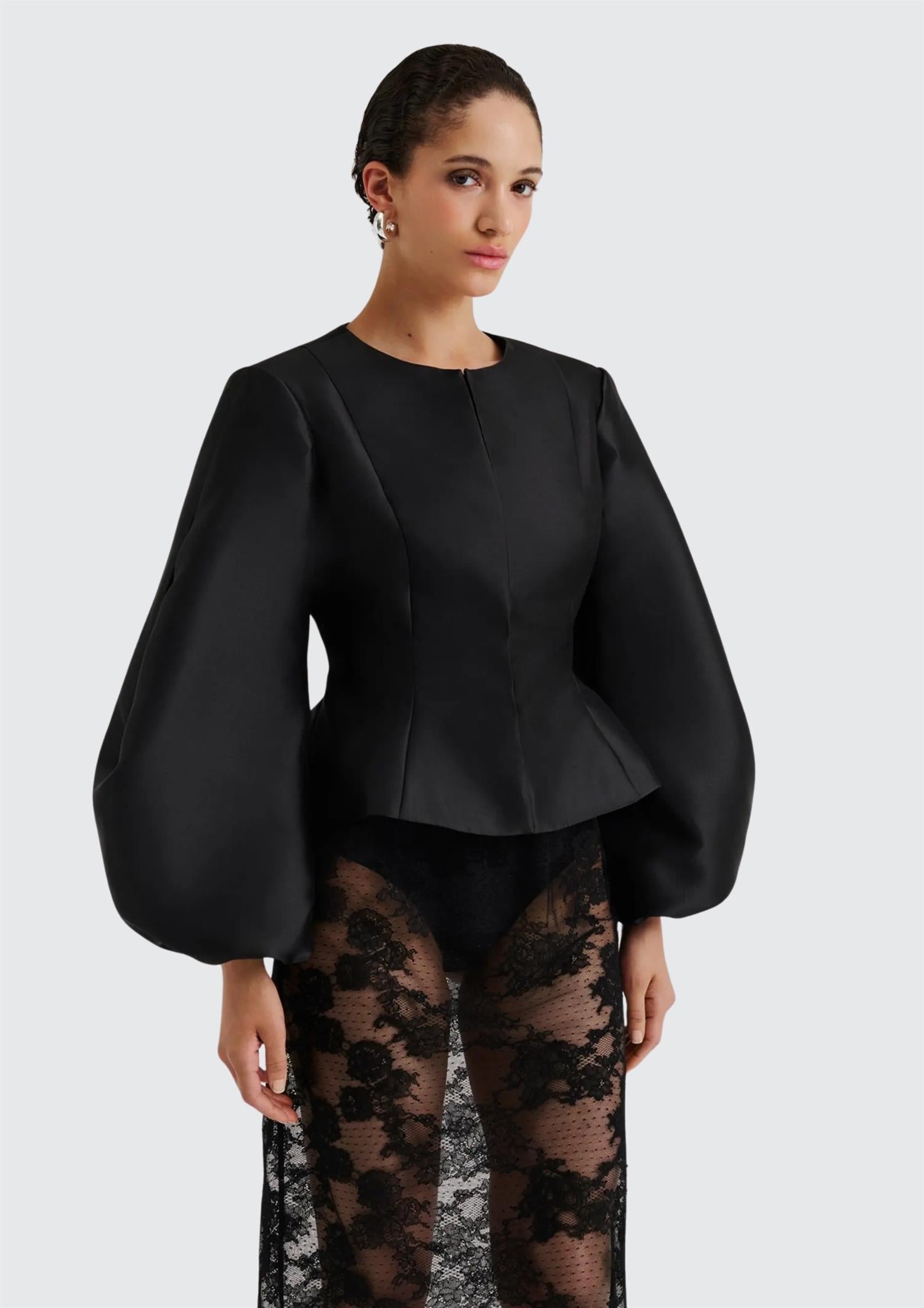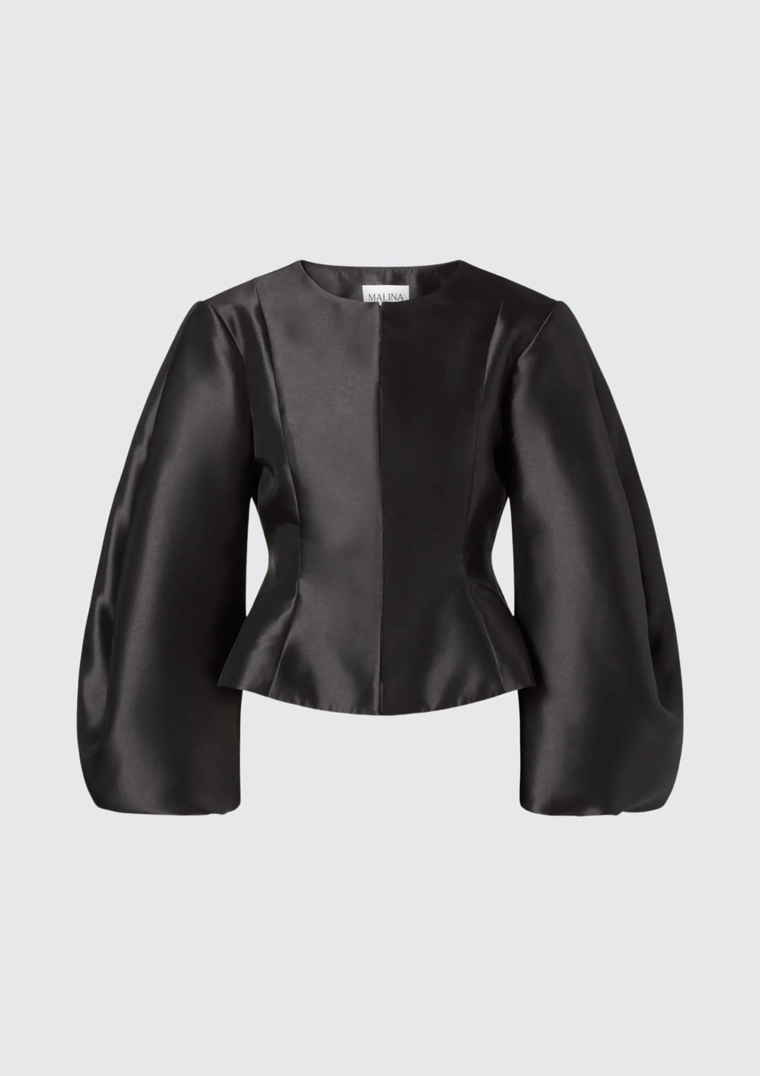 BESKRIVELSE: Vendela Balloon Sleeve Blouse fra Malina er en nydelig statement-bluse i sort med en elegant, shiny finish. Den har rund hals, voluminøse ermer med strikk nederst og en flatterende passform med innsving i midjen. Blusen lukkes med skjulte hemper foran for et rent uttrykk. Et sofistikert plagg som passer perfekt til penere anledninger - style den gjerne med et skjørt eller dressbukser for en komplett look.