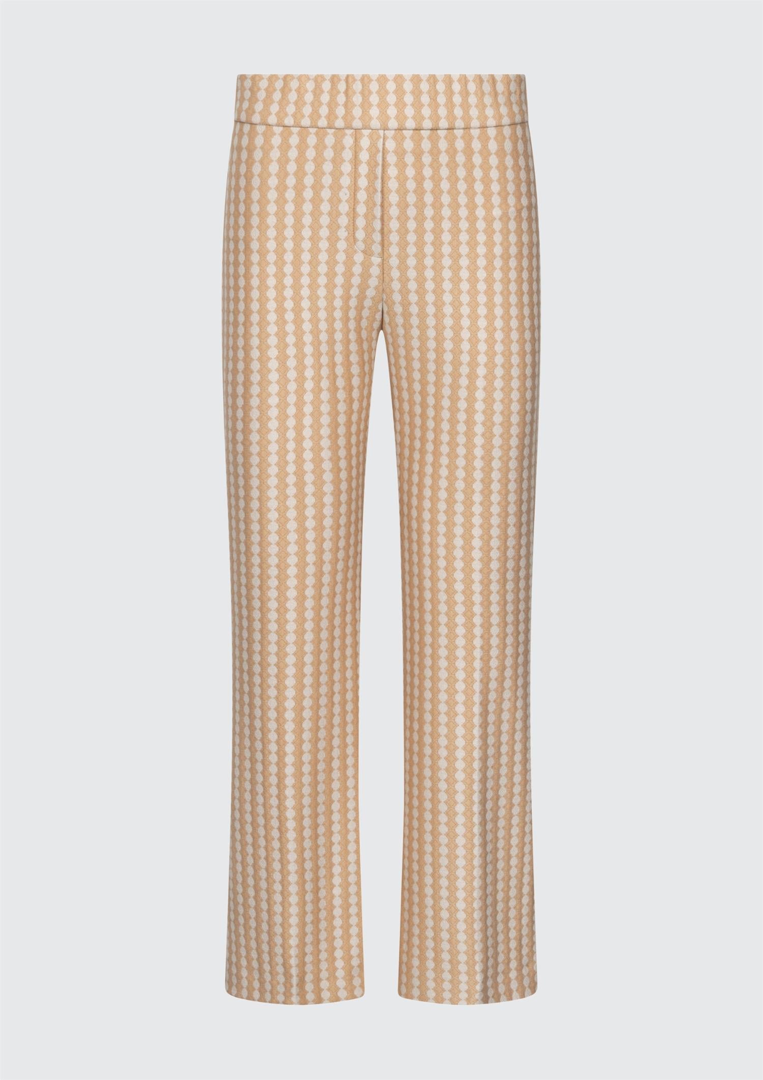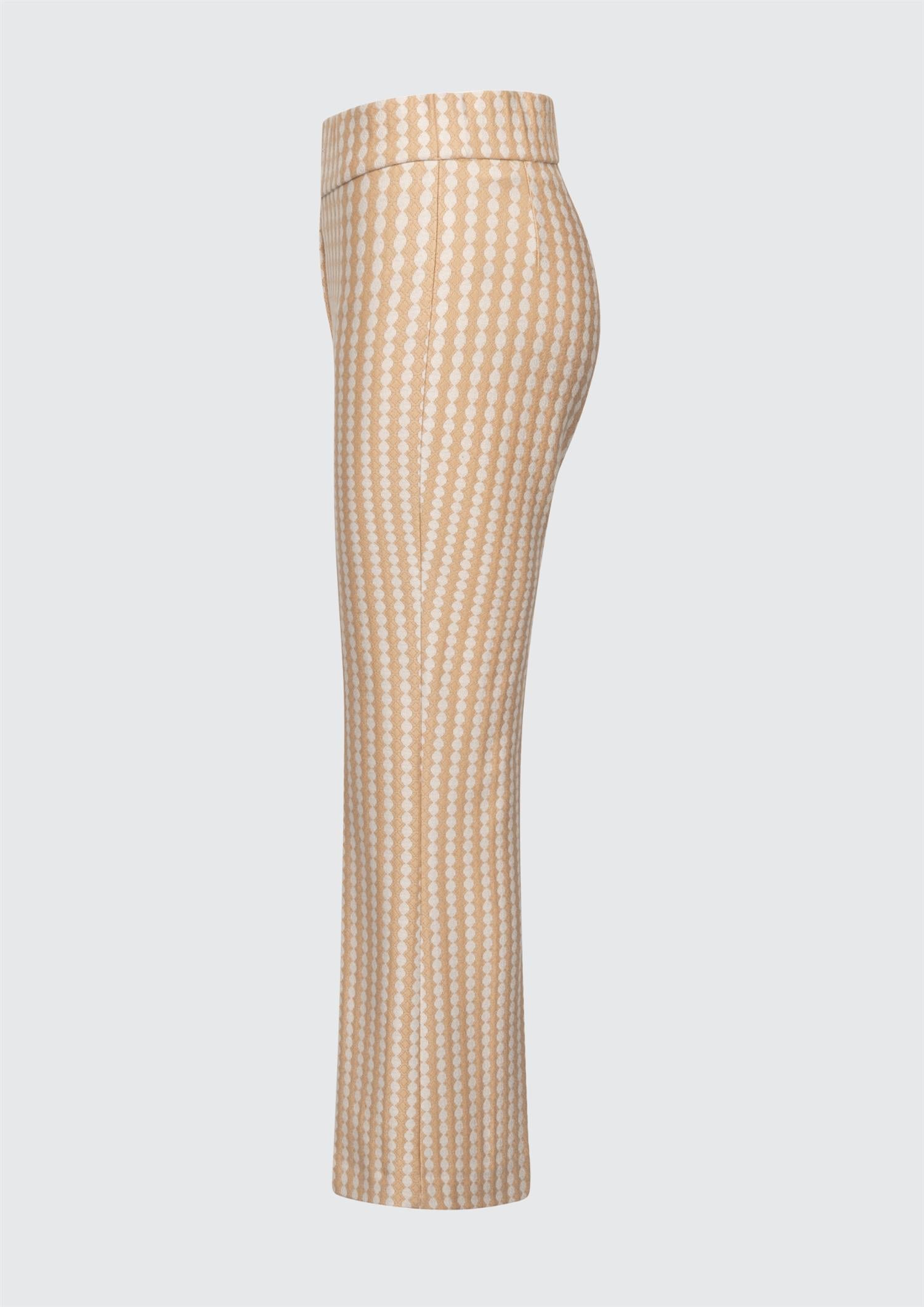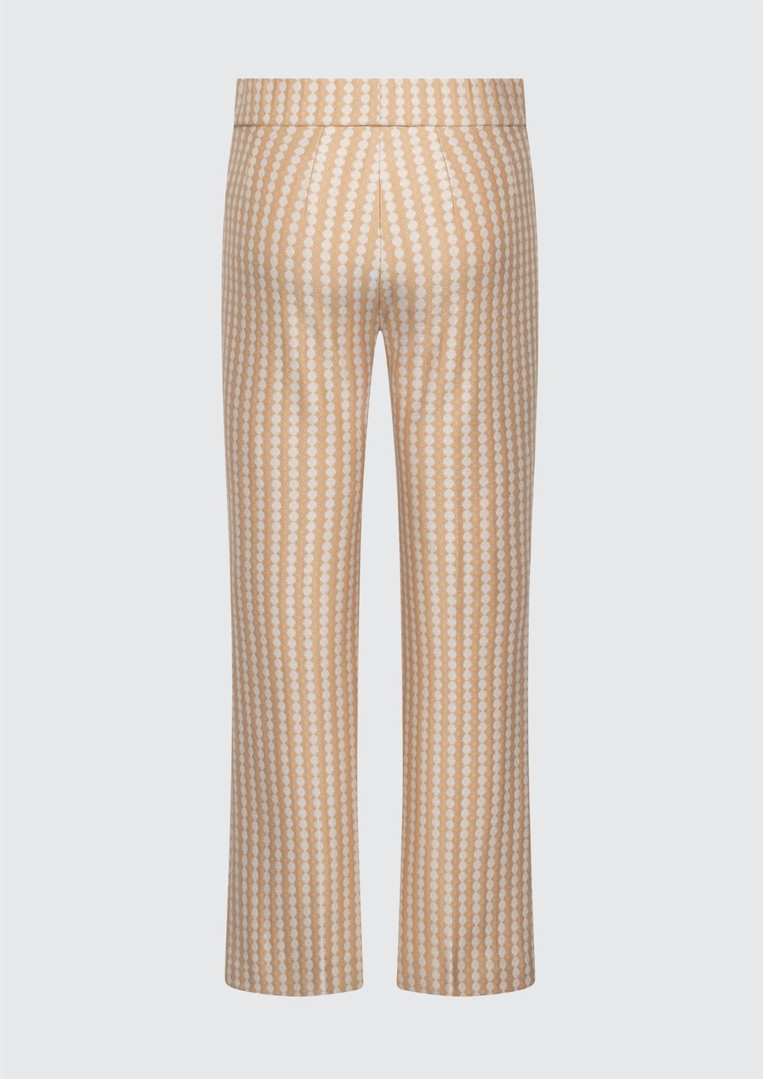 Buksen har vide, lett cropped ben som skaper en ren og balansert silhuett. Det grafiske mønsteret består av vertikalt arrangerte ovale former som gir et subtilt, men spennende uttrykk. Stoffet har høy formstabilitet og holder fasongen godt over tid.