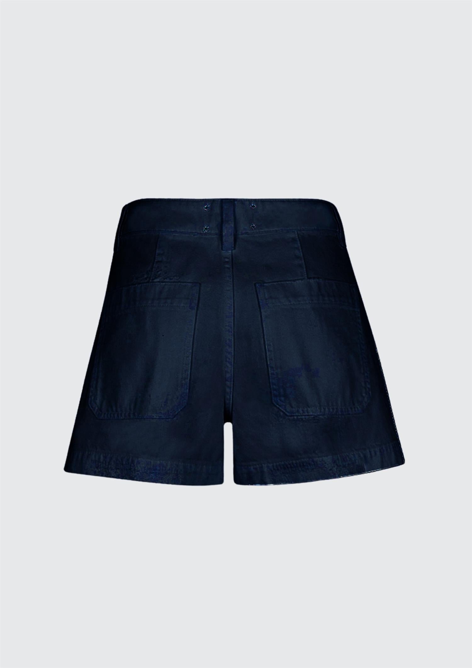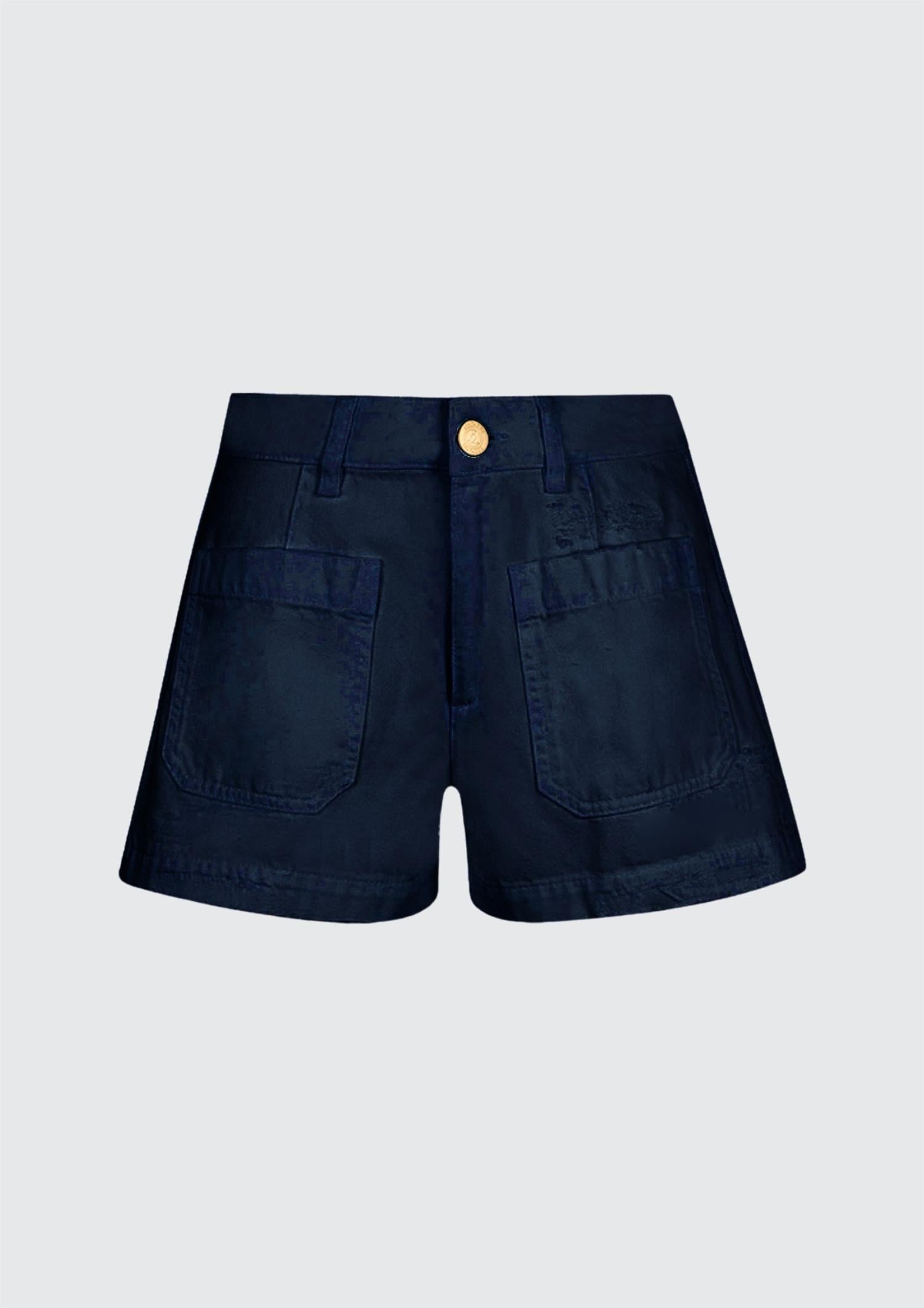 BESKRIVELSE: Mørk blå denimshorts med middels midje og fire påsydde lommer.