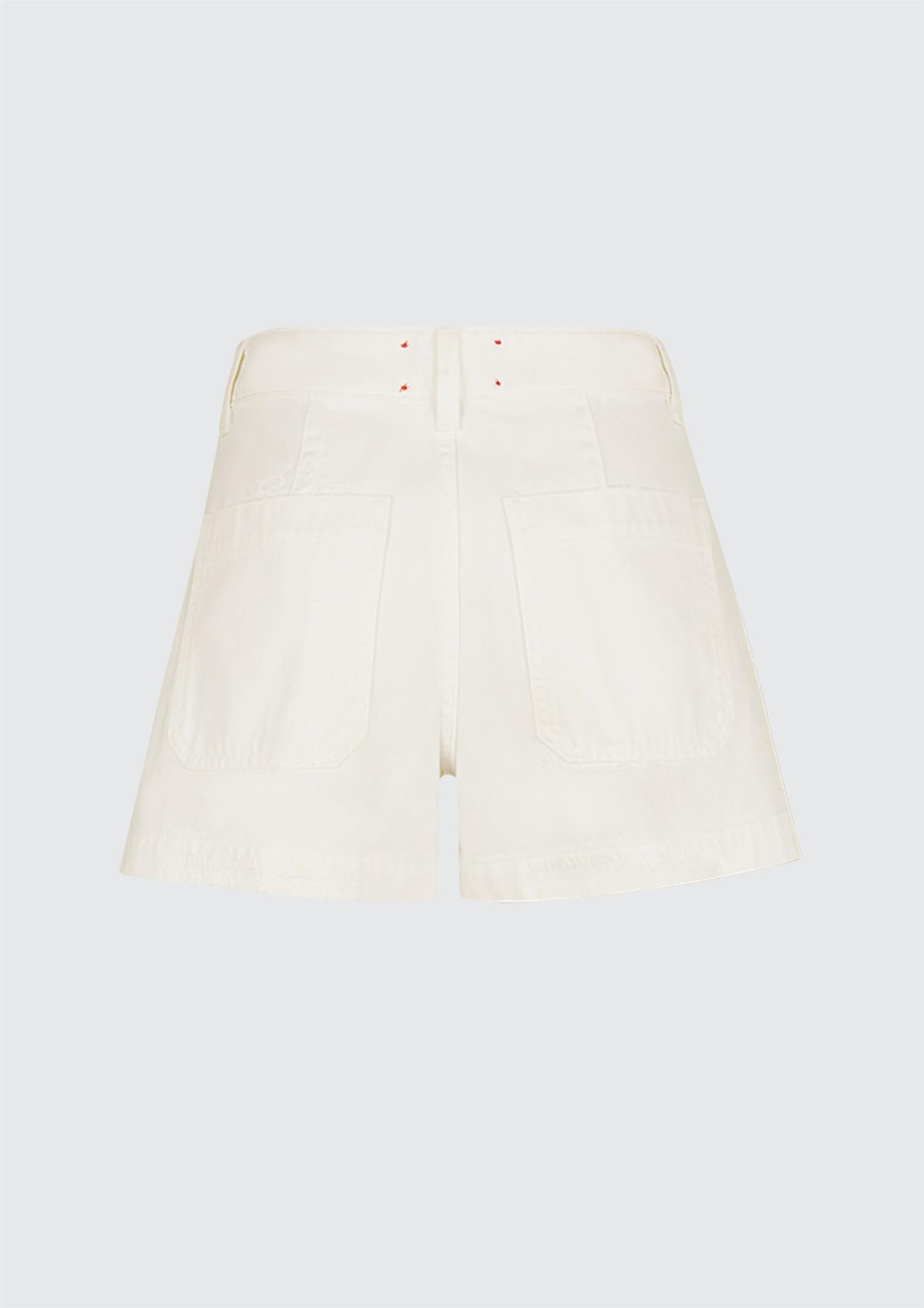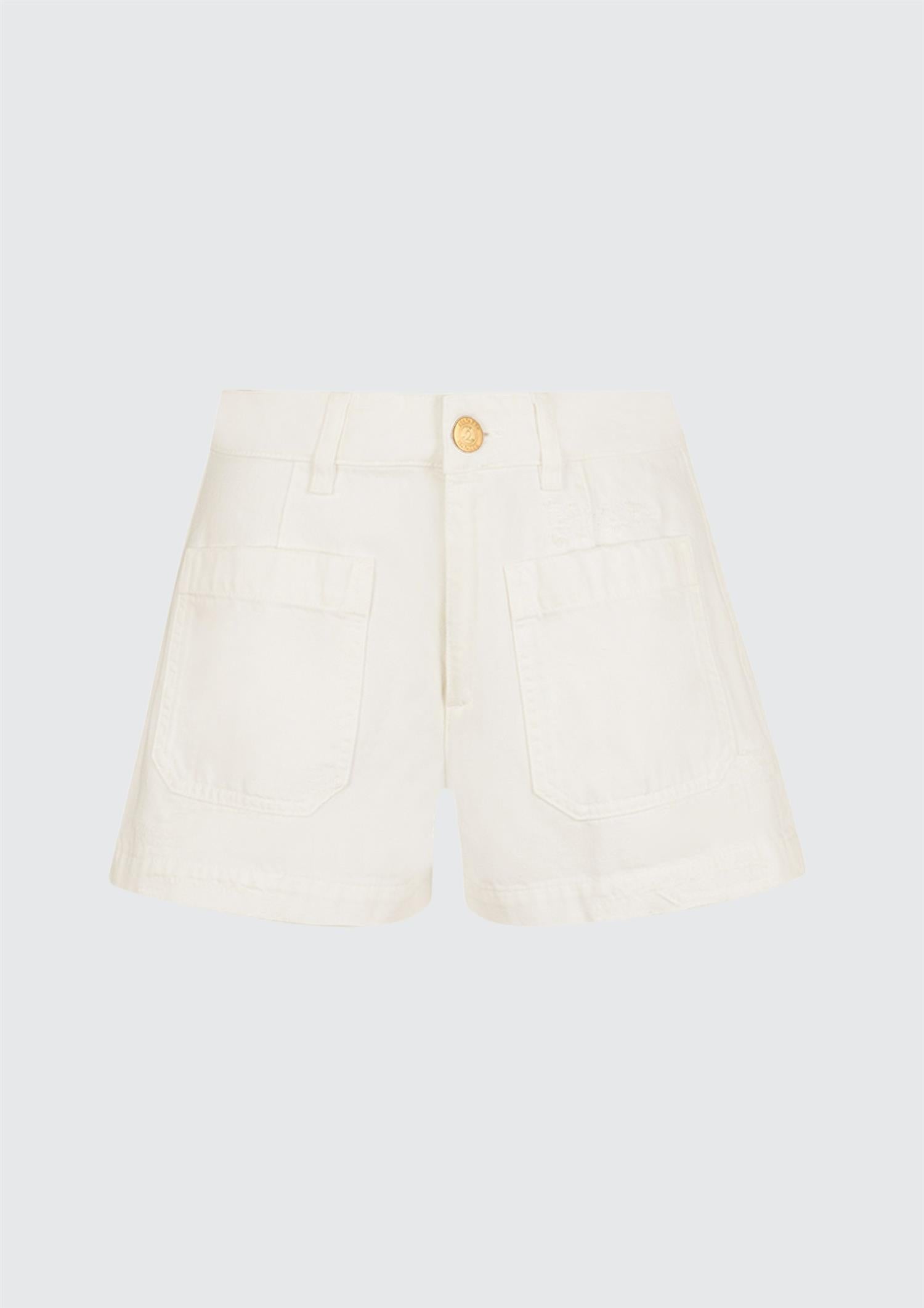 BESKRIVELSE: Hvite denimshorts med middels midje og fire påsydde lommer.