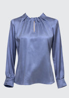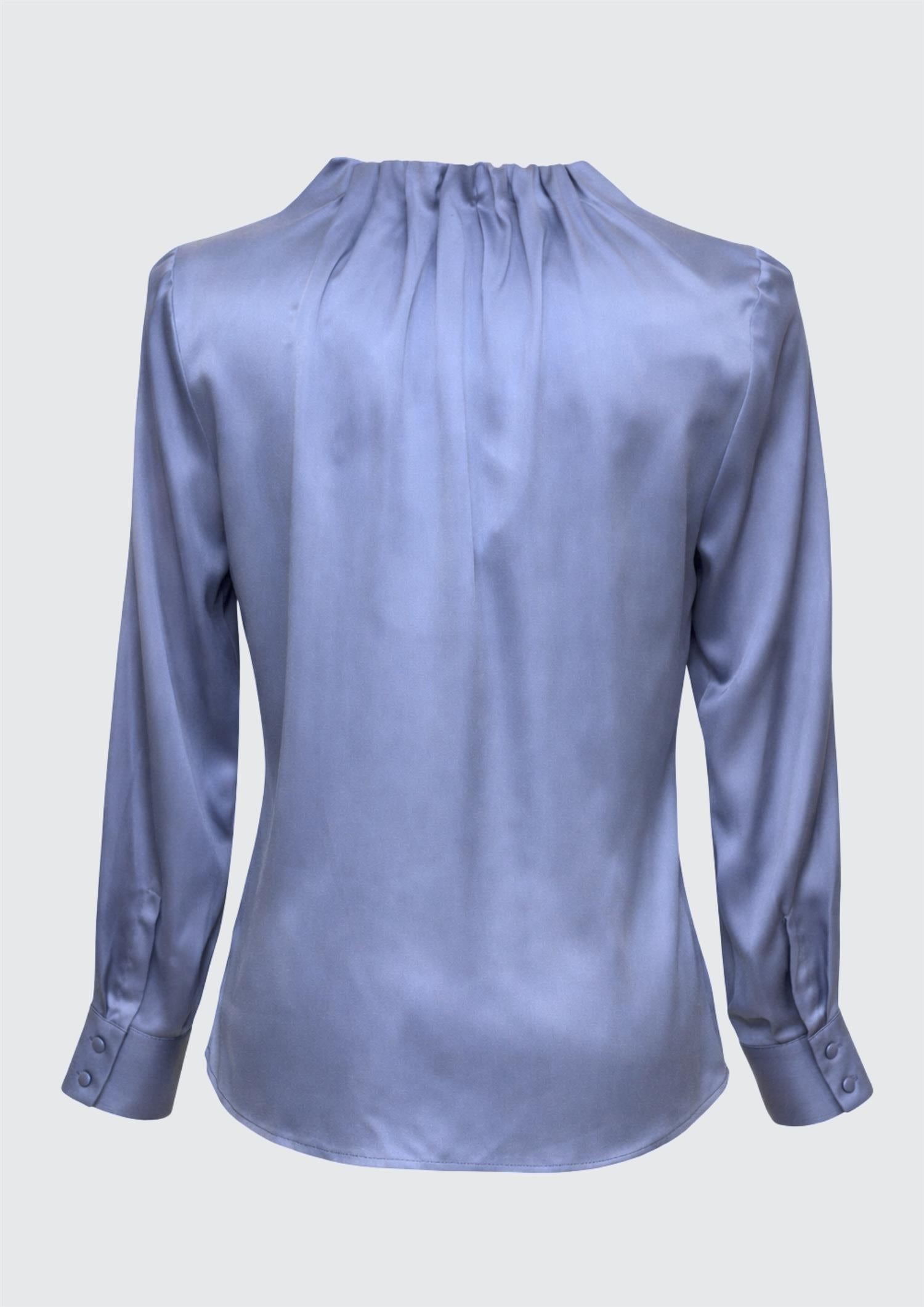 BESKRIVELSE: Langermet silkebluse i 100% sandvasket silke med detaljer i utringning. Denne silkeblusen gir det lille ekstra med sin drapering ved halsen. Silkeblusen har en skjult knapp foran ved kraven. Silkeblusen er derfor like fin åpen som lukket. Fasongen er feminin og rekker til hoftene. Silkeblusen er smal, men allikevel løstsittende.