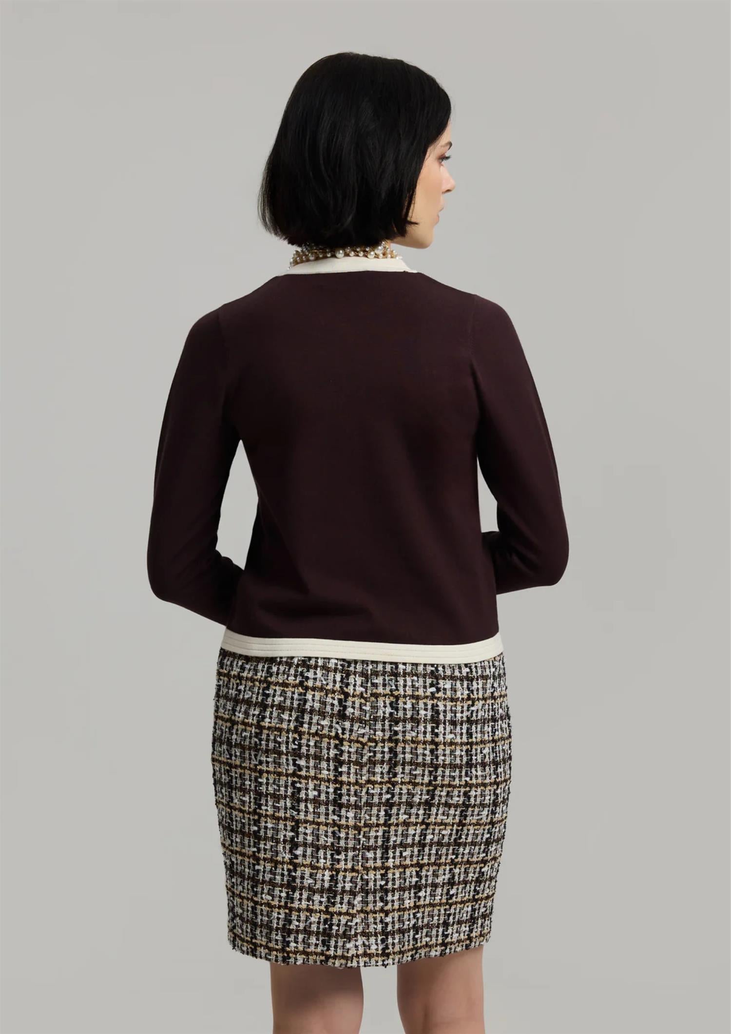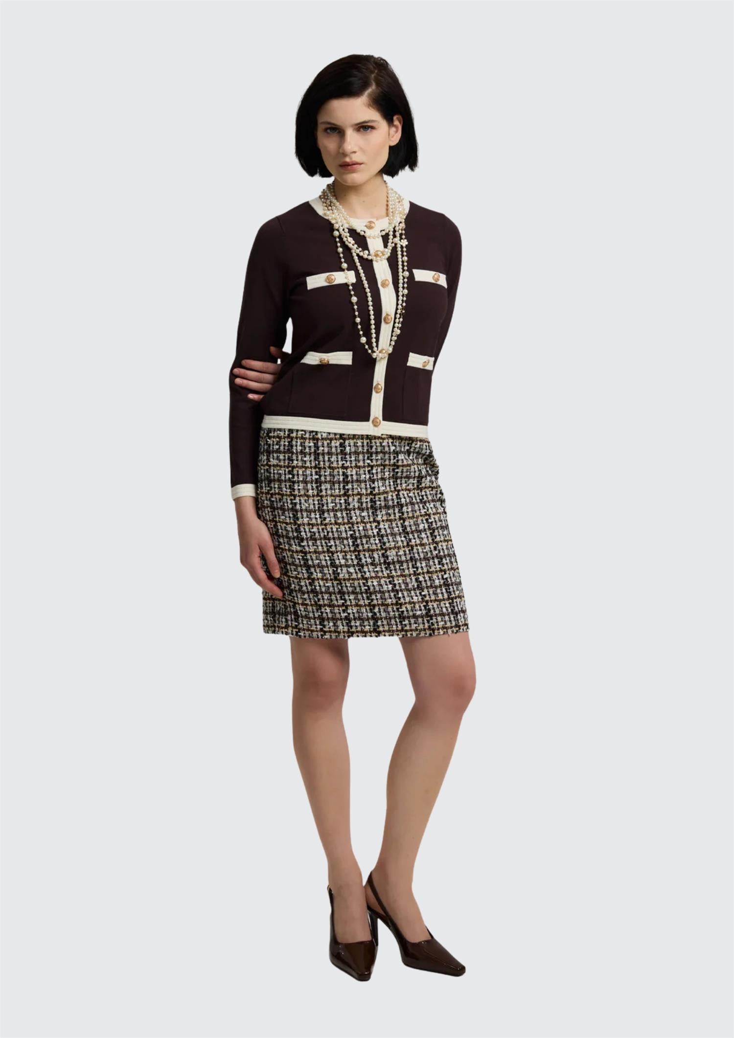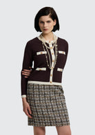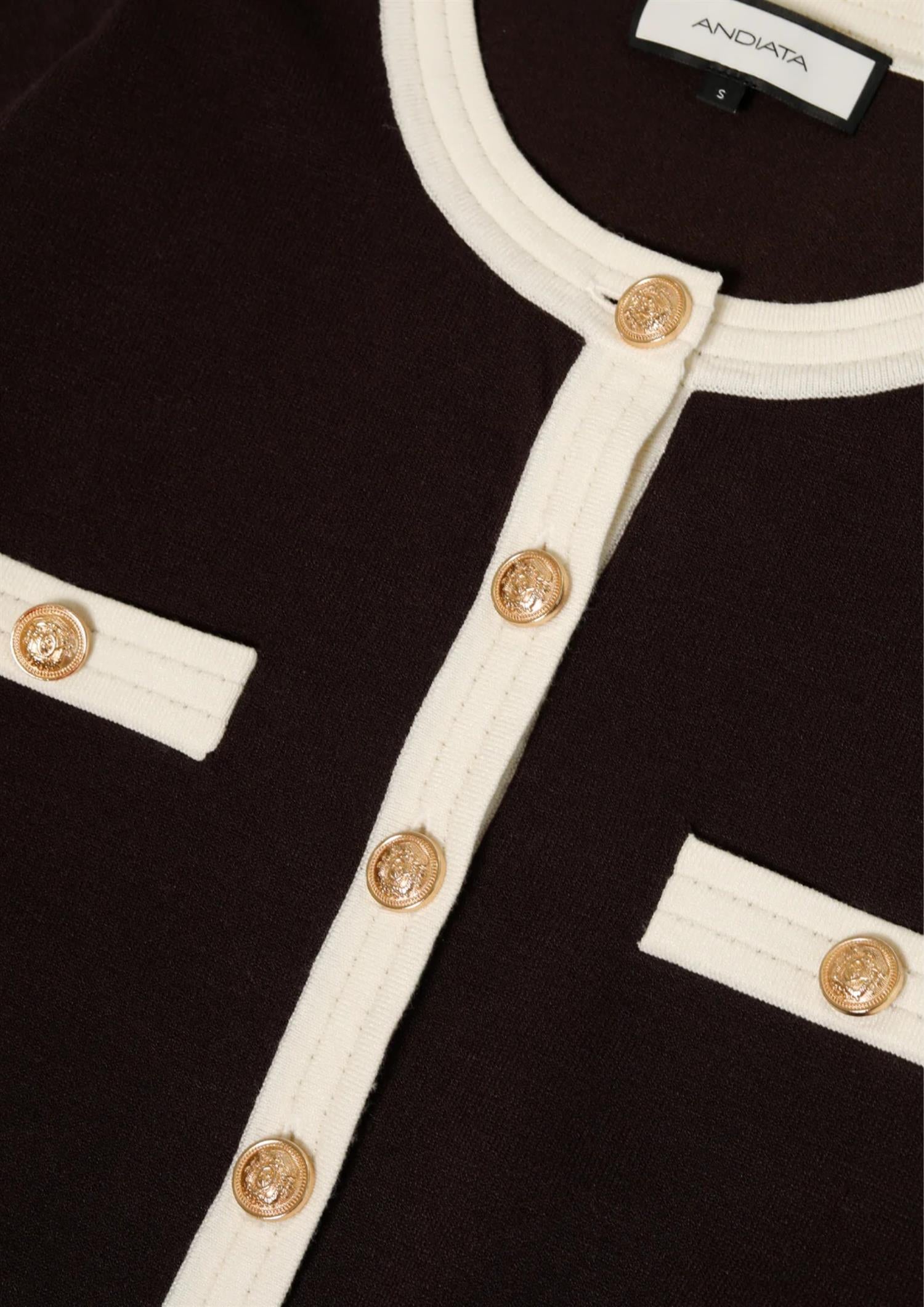 BESKRIVELSE: Brun og kremfarget cardigan med rund hals, dekorative gullknapper, lange ermer, to funksjonelle lommer og to imiterte brystlommer. Laget av myk og behagelig anti-pilling viskose.