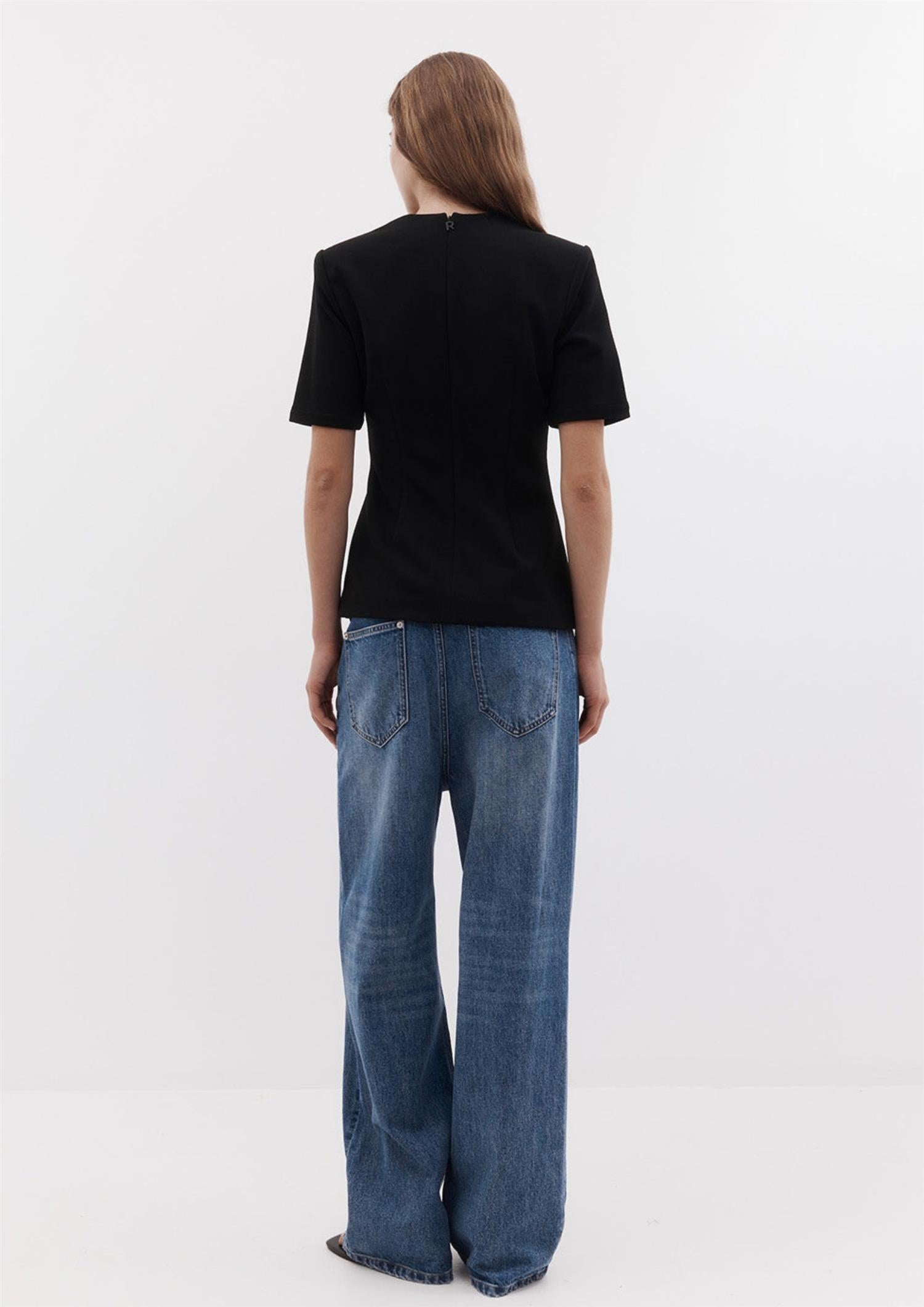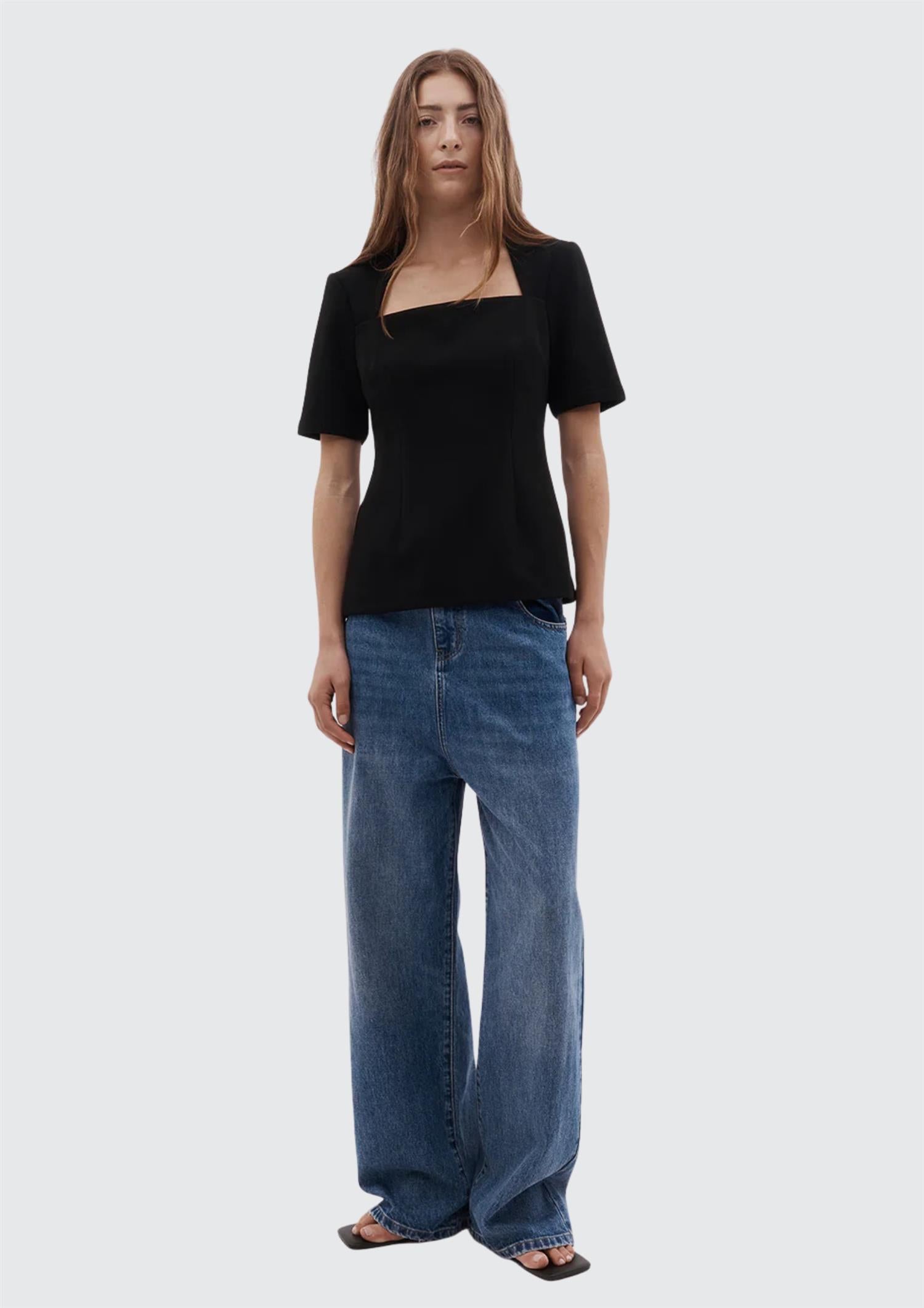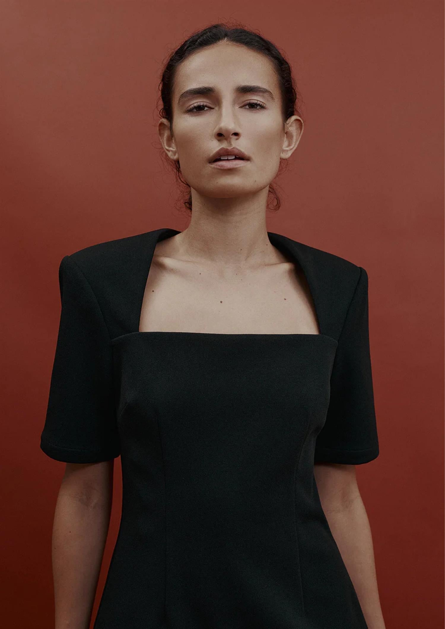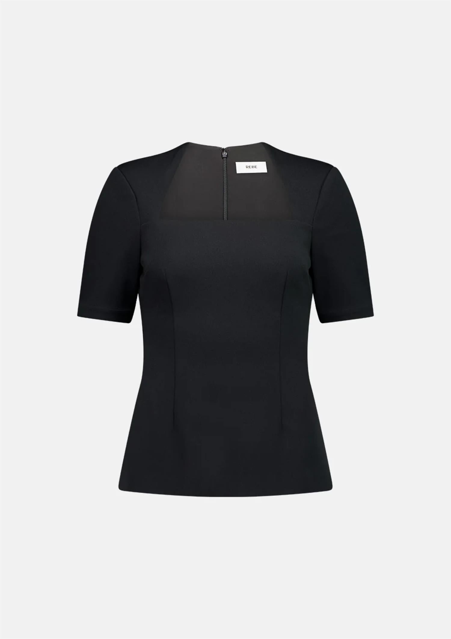 BESKRIVELSE: Elise-toppen har polstrede skuldre og en firkantet halsutringning for en skarp, strukturert silhuett. Den er formet i midjen for en flatterende passform, laget av komfortabelt, stretchbundet kreppstoff og lukkes med glidelås bak.