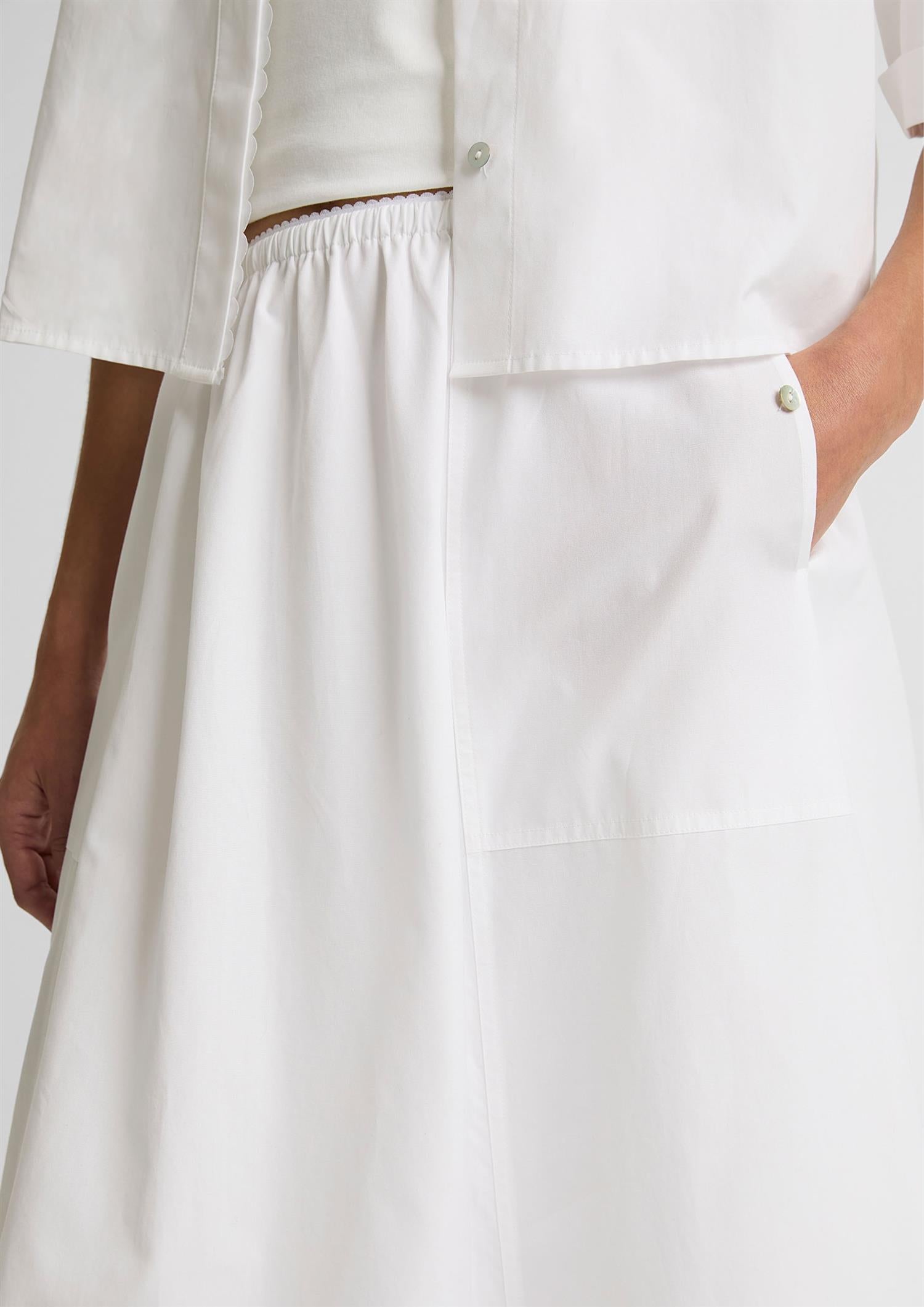 BESKRIVELSE: Lett og luftig midi-skjørt med feminin silhuett og et rent, sommerlig uttrykk. Skjørtet har elastisk midje for komfortabel passform og faller mykt nedover bena med god bevegelse. De diskrete detaljene i avslutningen gir et gjennomført og delikat preg. Like fint stylet med en enkel topp til hverdags som med skjorte eller strikk for et mer oppgradert uttrykk. En allsidig garderobeklassiker for varme dager.
