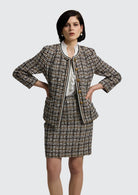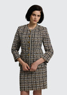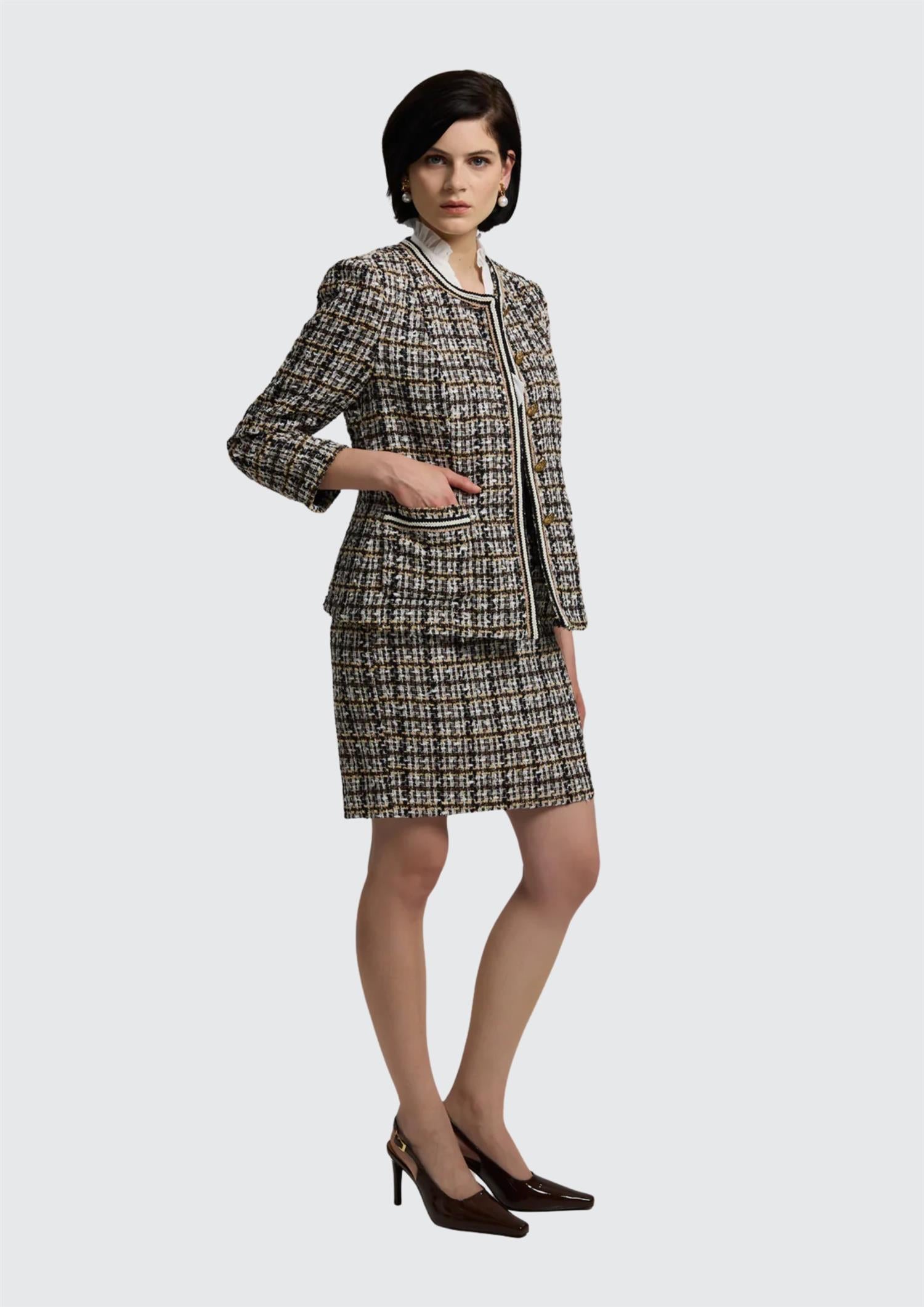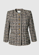 Blazeren har en figursydd silhuett som fremhever kroppen på en elegant og balansert måte, samtidig som den er helforet for optimal komfort og et pent fall. De ¾-lange ermene tilfører et lett og feminint preg, mens den runde halsutringningen gir et raffinert alternativ til den klassiske jakkekragen. Praktiske lommer kombineres med gjennomtenkte detaljer som gylne knapper og dekorativ tape, noe som understreker plaggets eksklusive håndverk og kvalitetsfølelse.