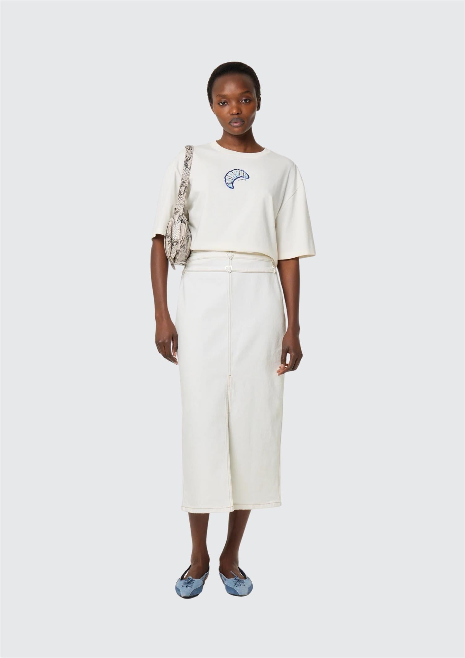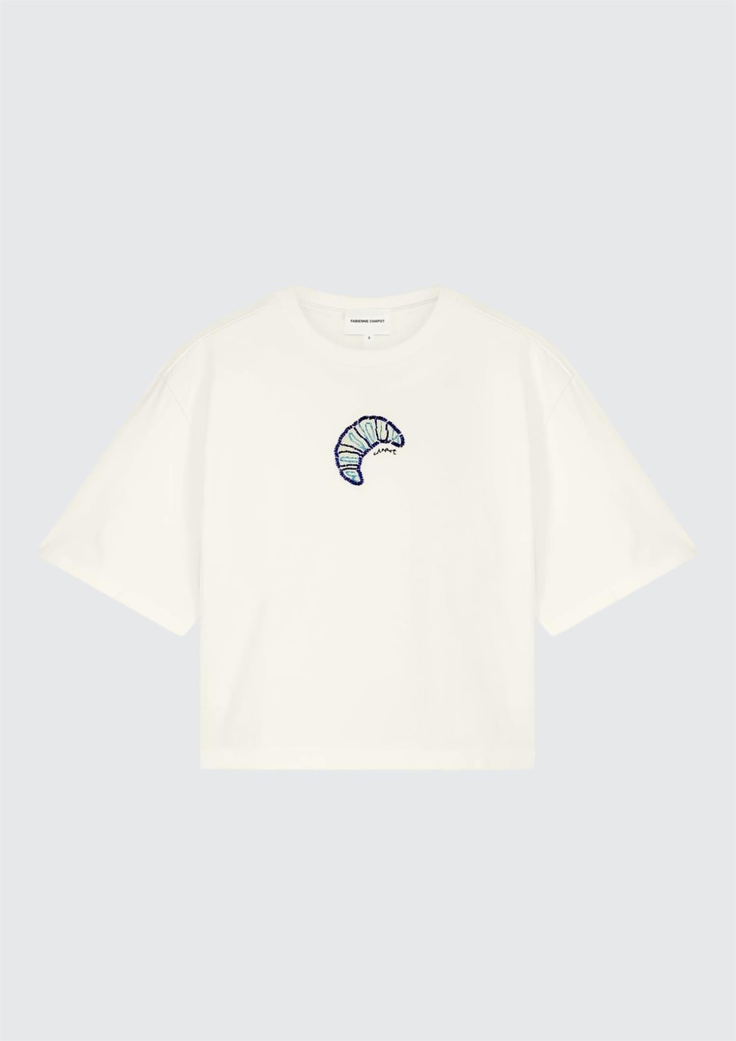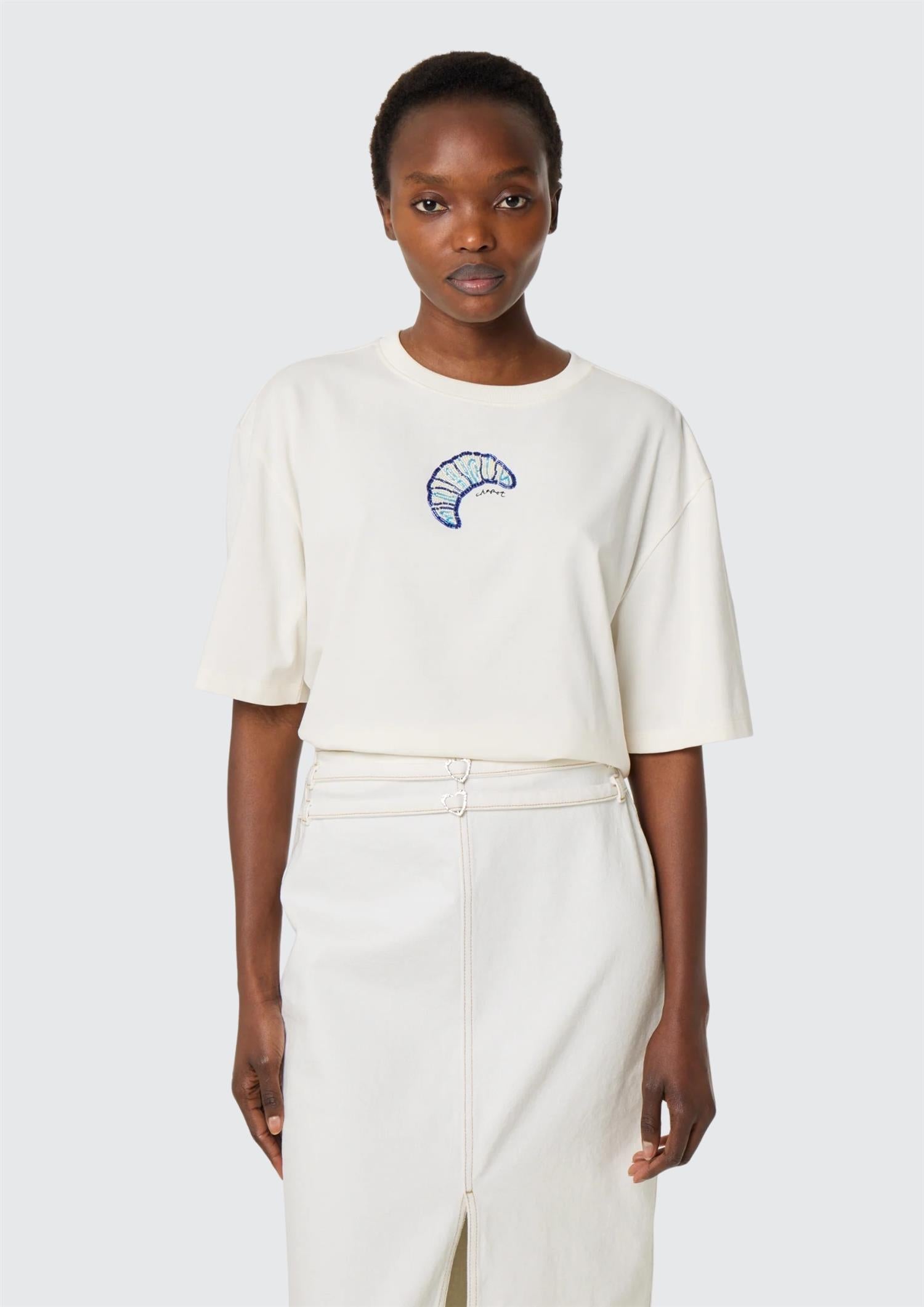 BESKRIVELSE: Denne avslappede T-skjorten har et lekent croissanttrykk foran. Med sitt pustende stoff og løse silhuett er den et komfortabelt og avslappet hverdagsplagg.