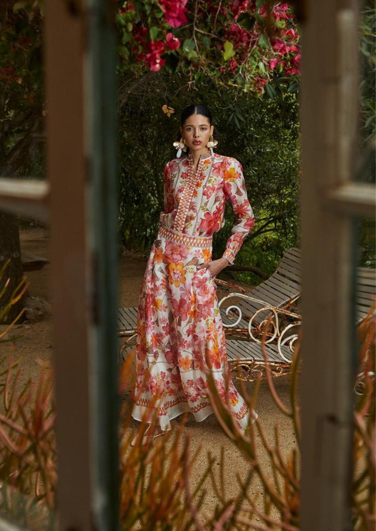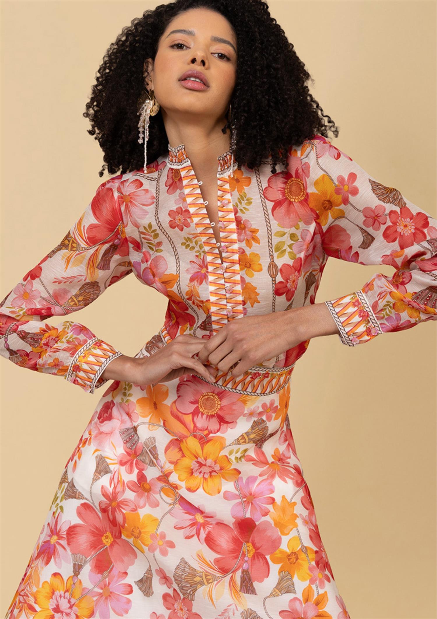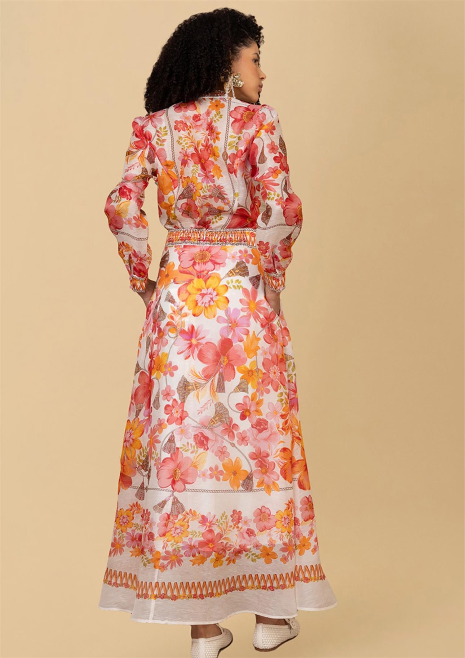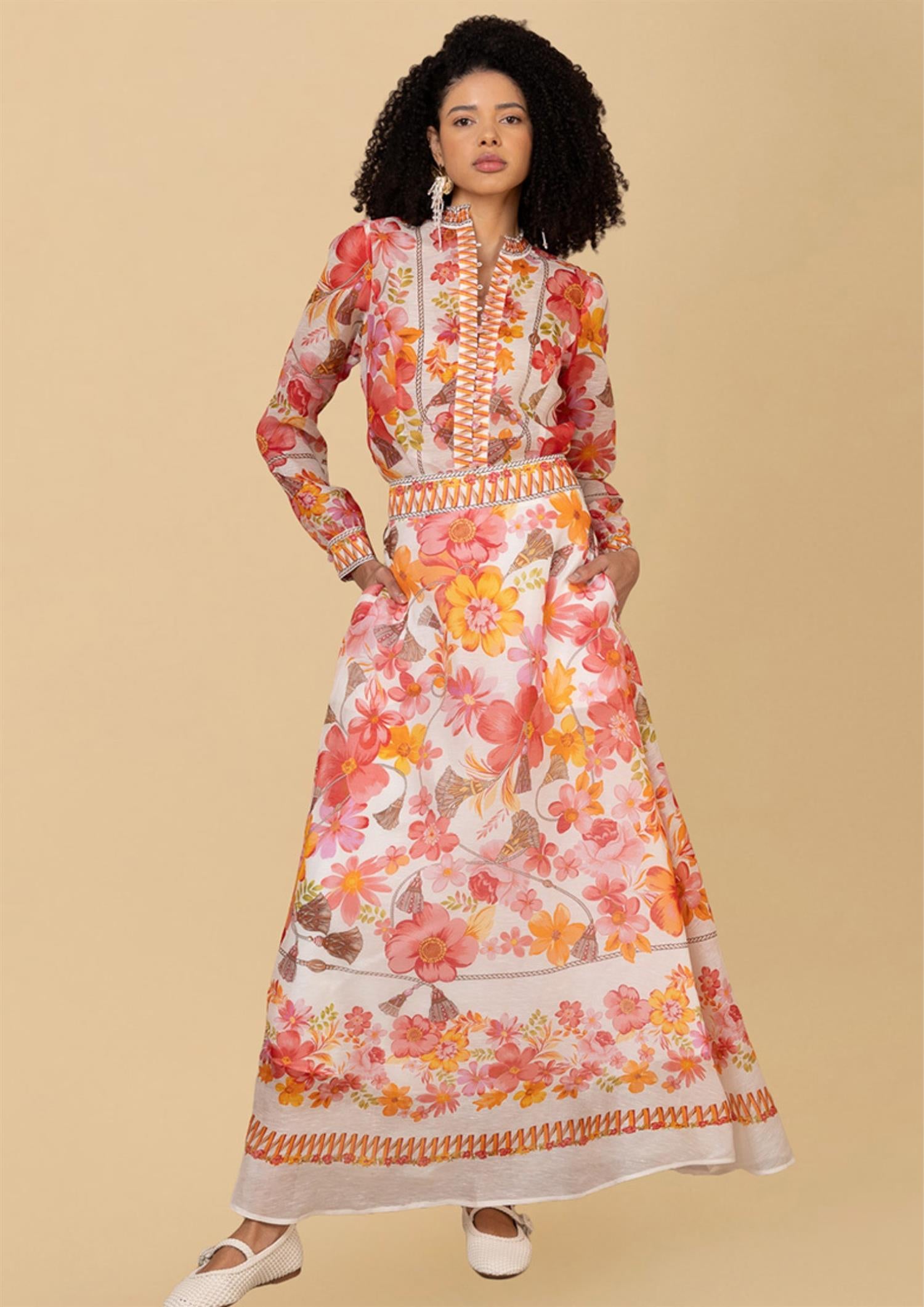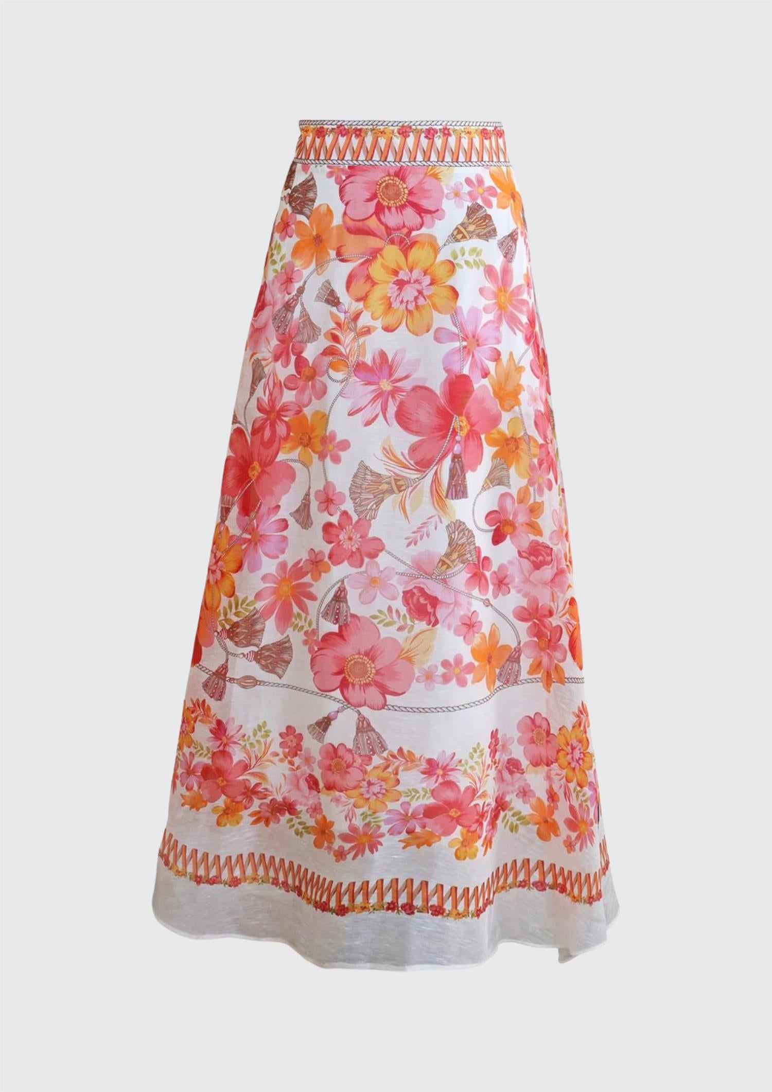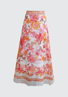BESKRIVELSE: Quitterie Long Skirt er et vakkert maxiskjørt fra Hale Bob. Skjørtet er laget i en luksuriøs og lett blanding av silke og lin, med et sommerlig mønster av blomster og dusker i varme koralltoner. Skjørtet har en flatterende, høy midje og et A-linjeformet snitt som skaper en elegant silhuett. Et dekorativt, vevd bånd i midjen og langs kanten nederst gir skjørtet en unik og bohemsk finish, perfekt for varme dager.