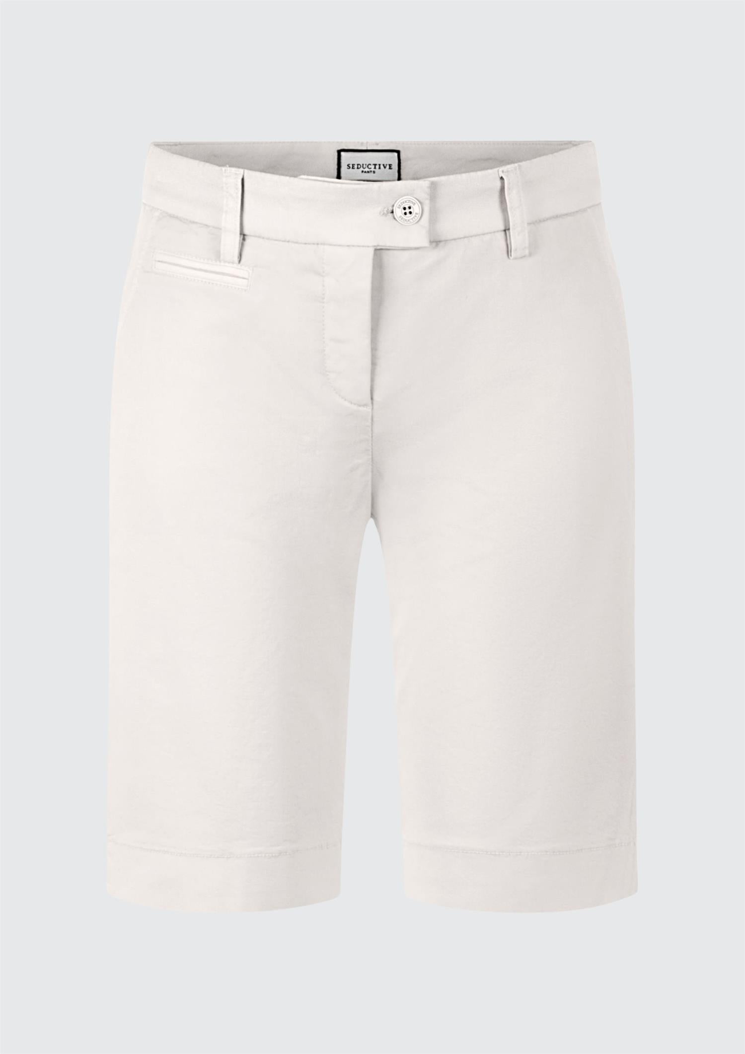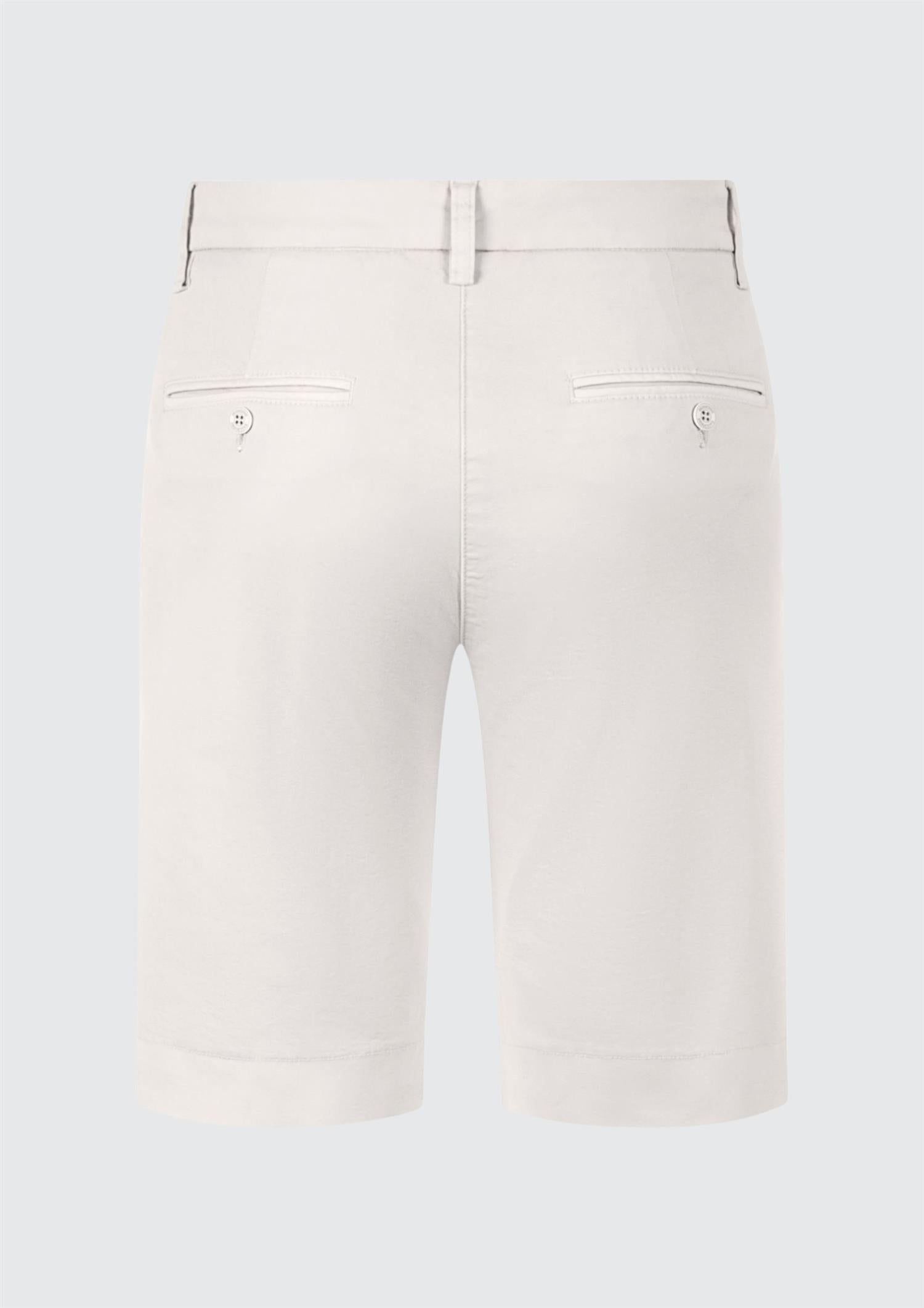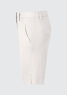 BESKRIVELSE: Klassisk og sofistikert shorts med en ren og tidløs silhuett. Modellen har en flatterende, middels høy midje med linning og beltehemper, lukkes med knapp og skjult glidelås for et minimalistisk uttrykk. Den er designet med skrålommer i sidene og diskret passpolert lomme bak, som gir et skreddersydd preg.