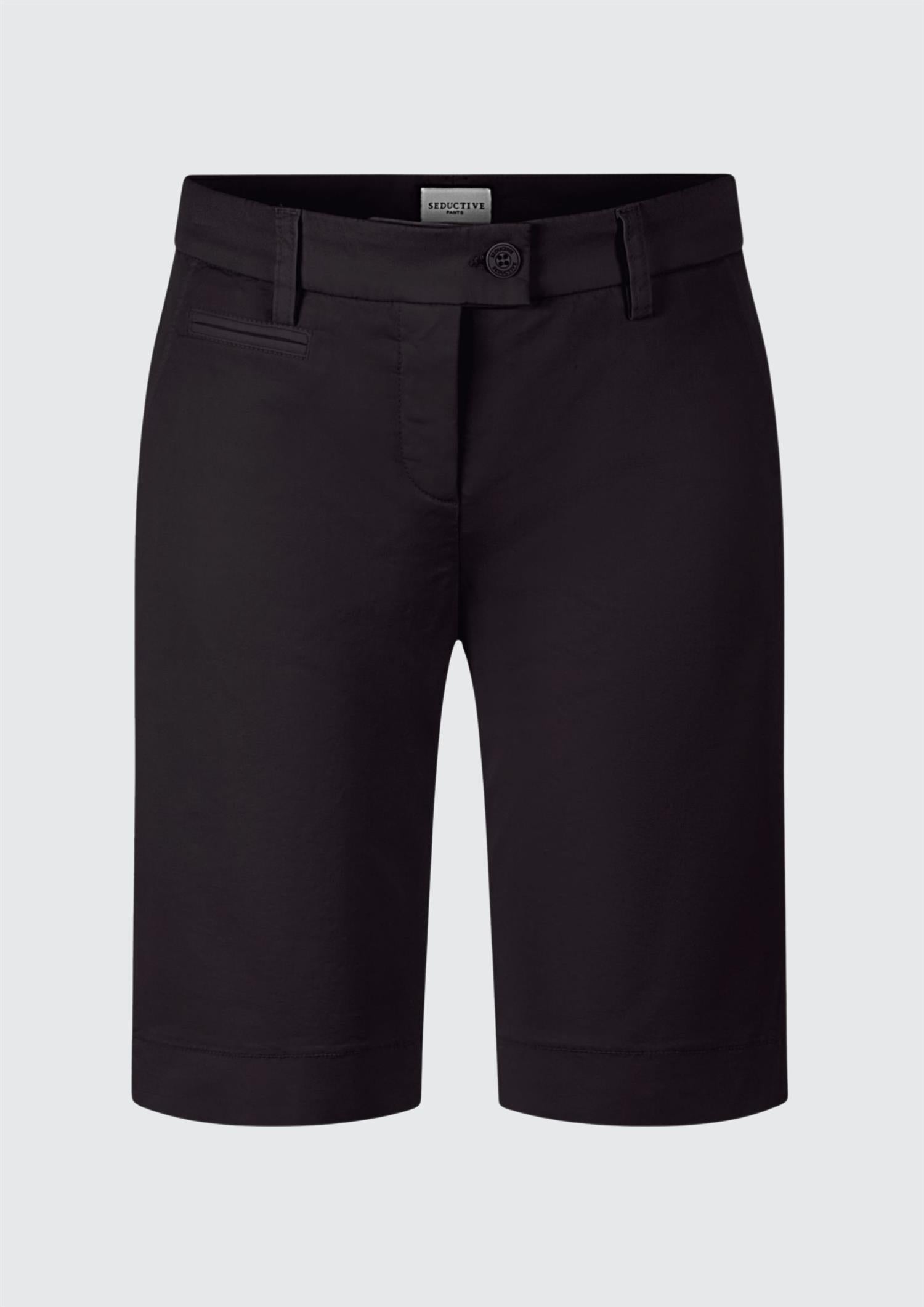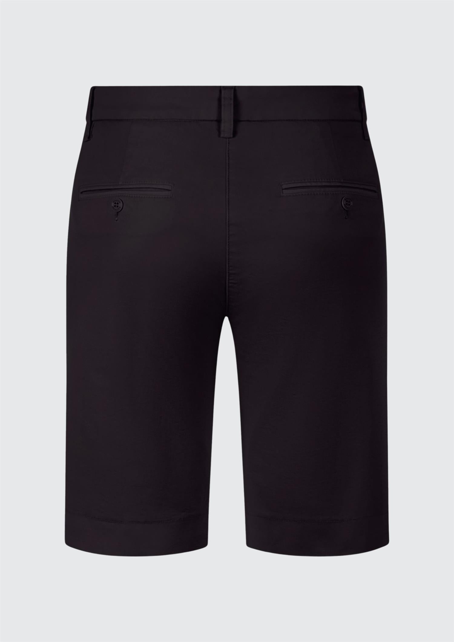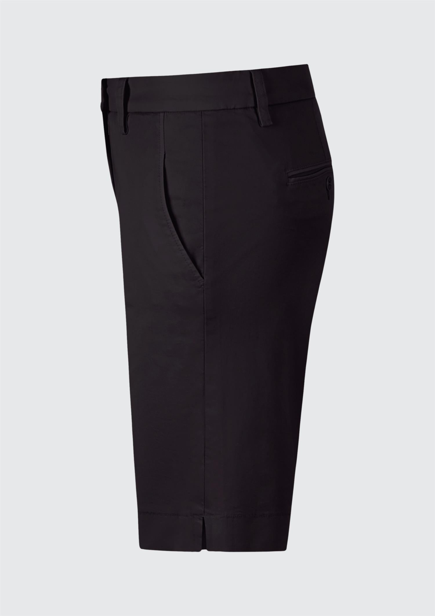 BESKRIVELSE: Klassisk og sofistikert shorts med en ren og tidløs silhuett. Modellen har en flatterende, middels høy midje med linning og beltehemper, lukkes med knapp og skjult glidelås for et minimalistisk uttrykk. Den er designet med skrålommer i sidene og diskret passpolert lomme bak, som gir et skreddersydd preg.