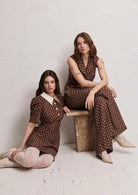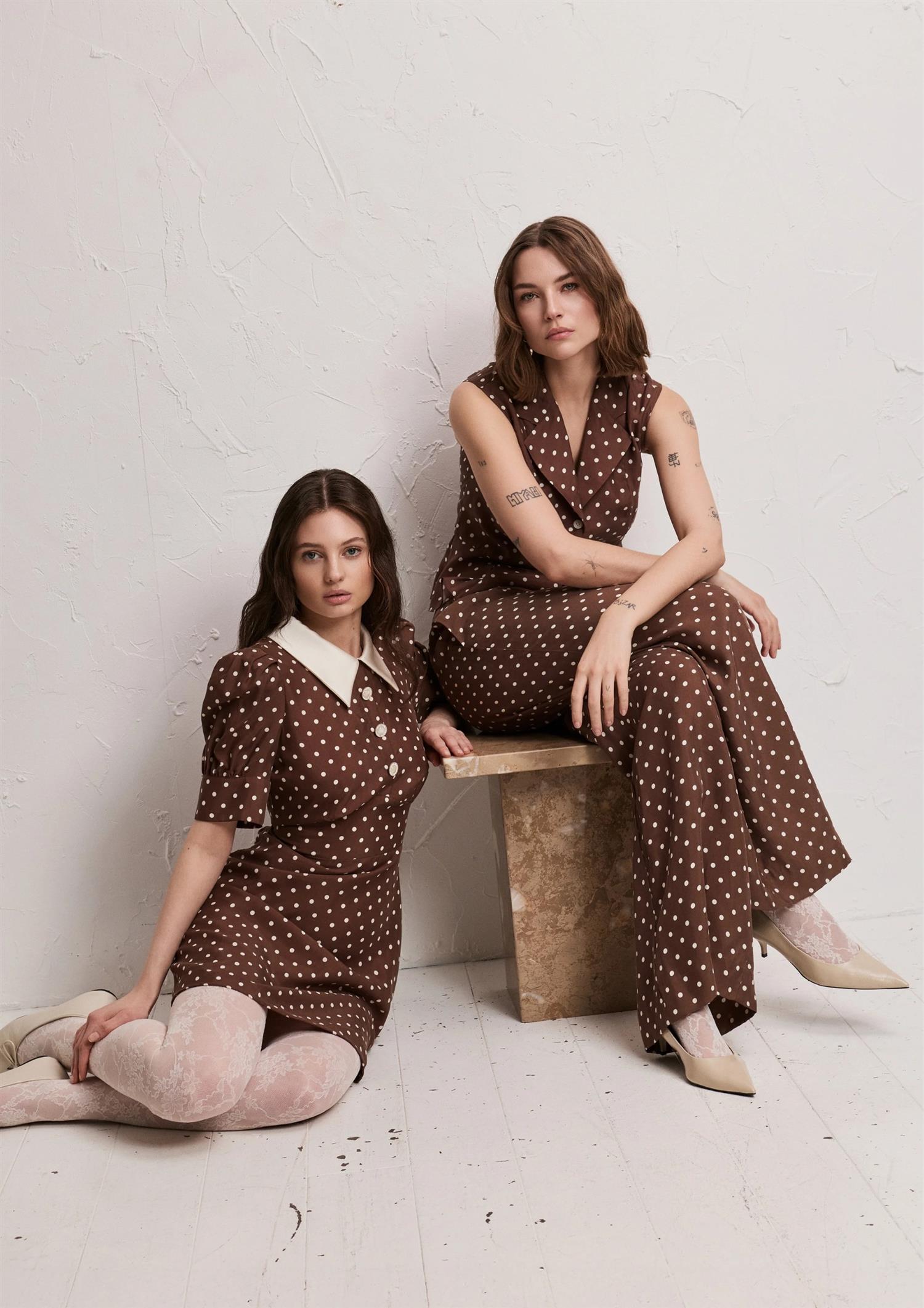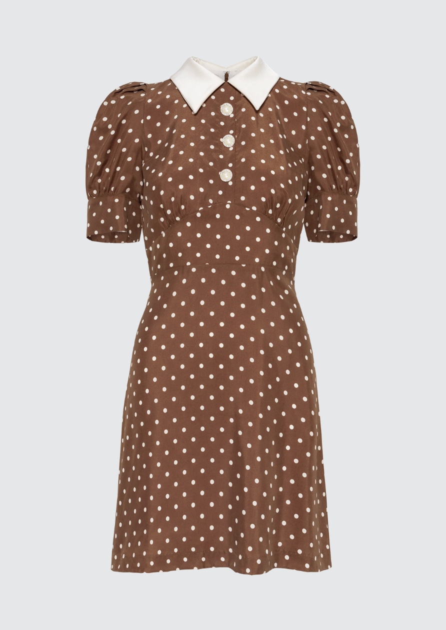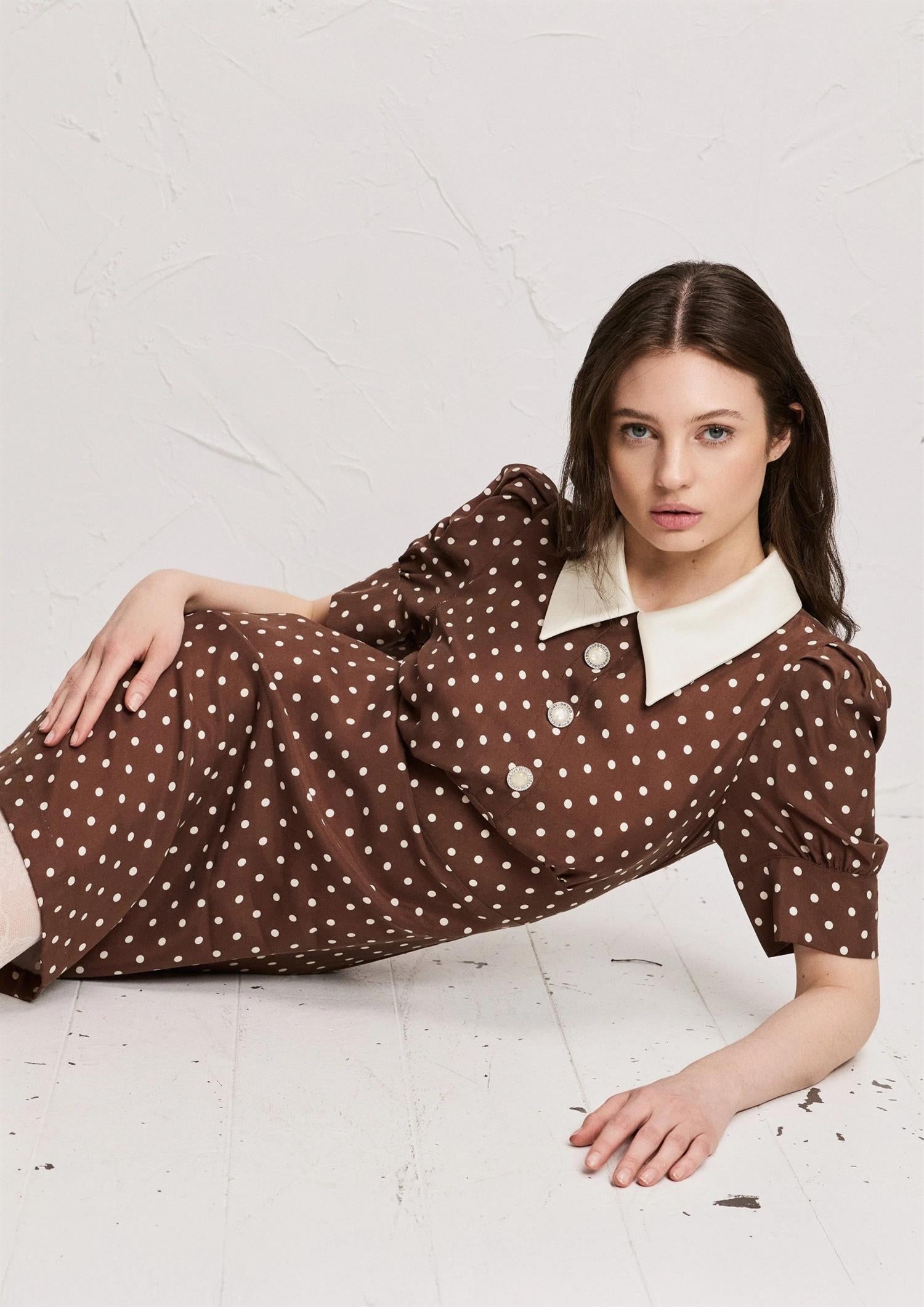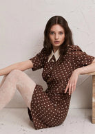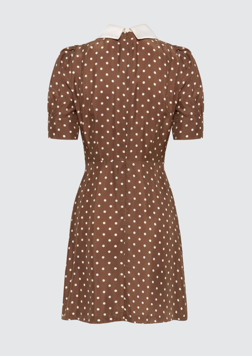 BESKRIVELSE: En kort kjole med brunt prikkete print, med en definert midje og en lett skatersilhuett. Designet med korte puffermer, knapper foran og et lett utsvingt skjørt. Stoffet føles glatt og luftig, behagelig mot kroppen og behagelig å bruke hele dagen. Passer like godt til mer pene anledninger. Et enkelt plagg som fungerer uten anstrengelse hele livet.