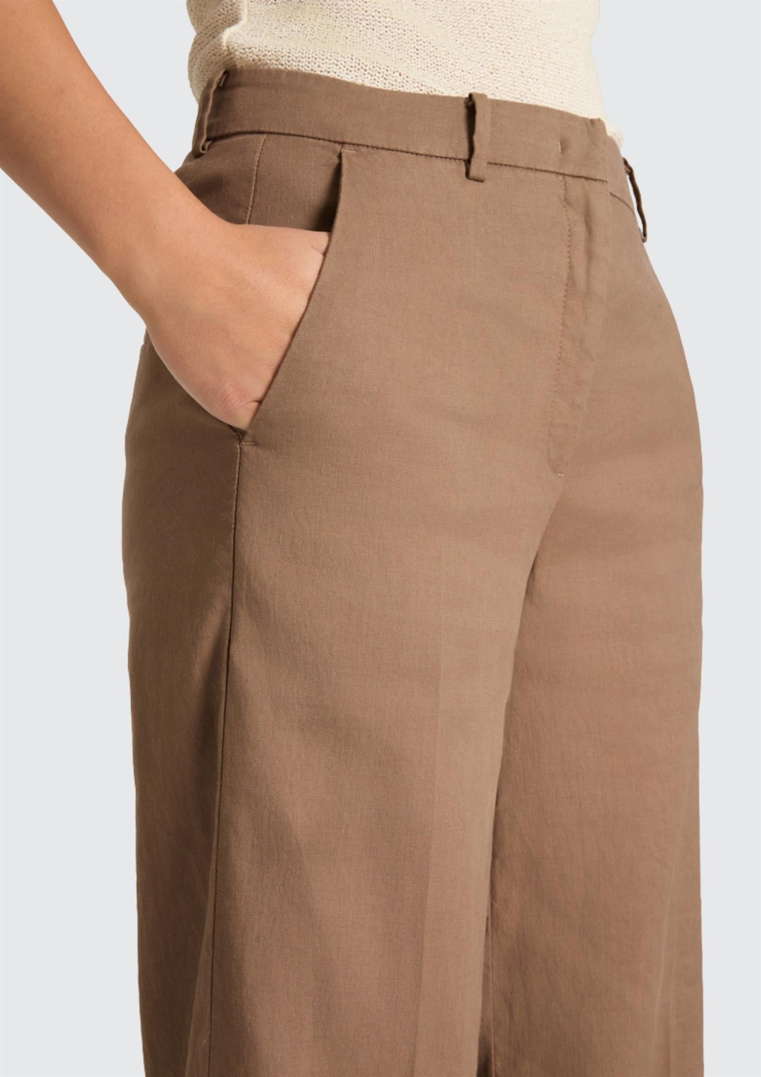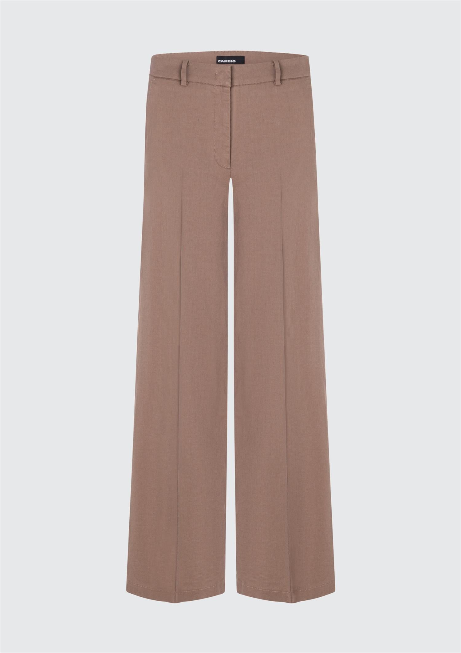 BESKRIVELSE: Sommerbukse fra Cambio i modellen Mira. Buksen har to skrålommer i front og to skjulte baklommer.. Buksen linning med beltestropper, med god vidde hele veien. Lekker bukse til vår og sommerdager