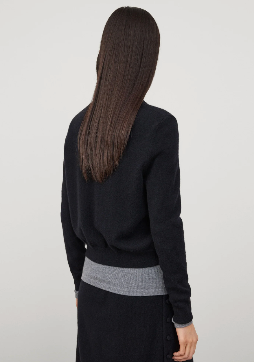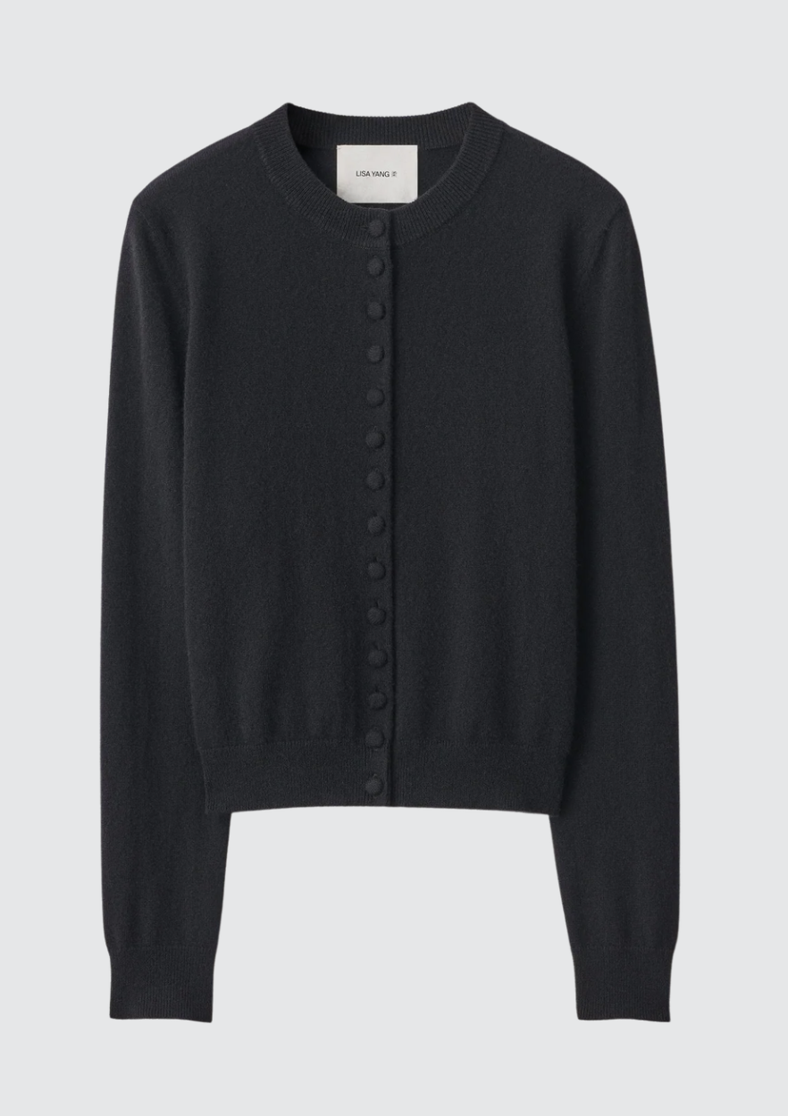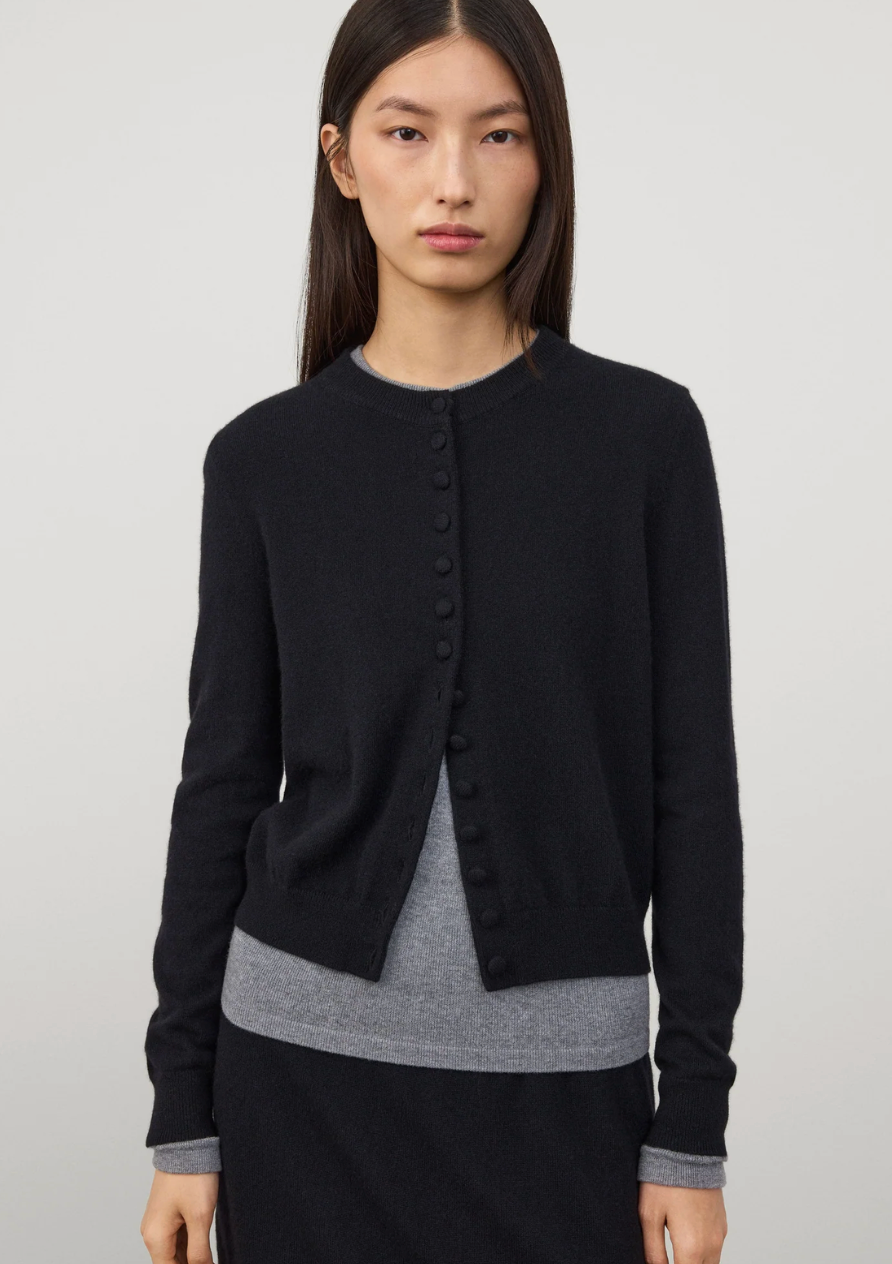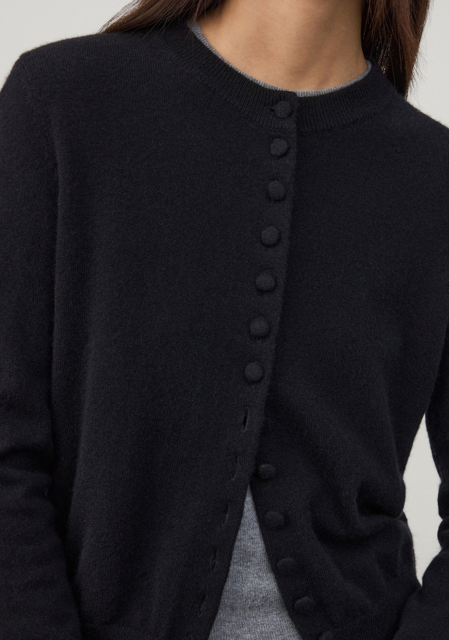 BESKRIVELSE: Wilona-cardiganen har en ny sesongbasert silhuett, og er laget av mellomtung, enkelstrikket kasjmir for et feminint uttrykk. Den tettsittende, hoftelange silhuetten har rund hals, lange ermer og ton-til-ton kasjmir-dekkede knapper som understreker antrekket.