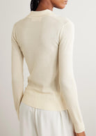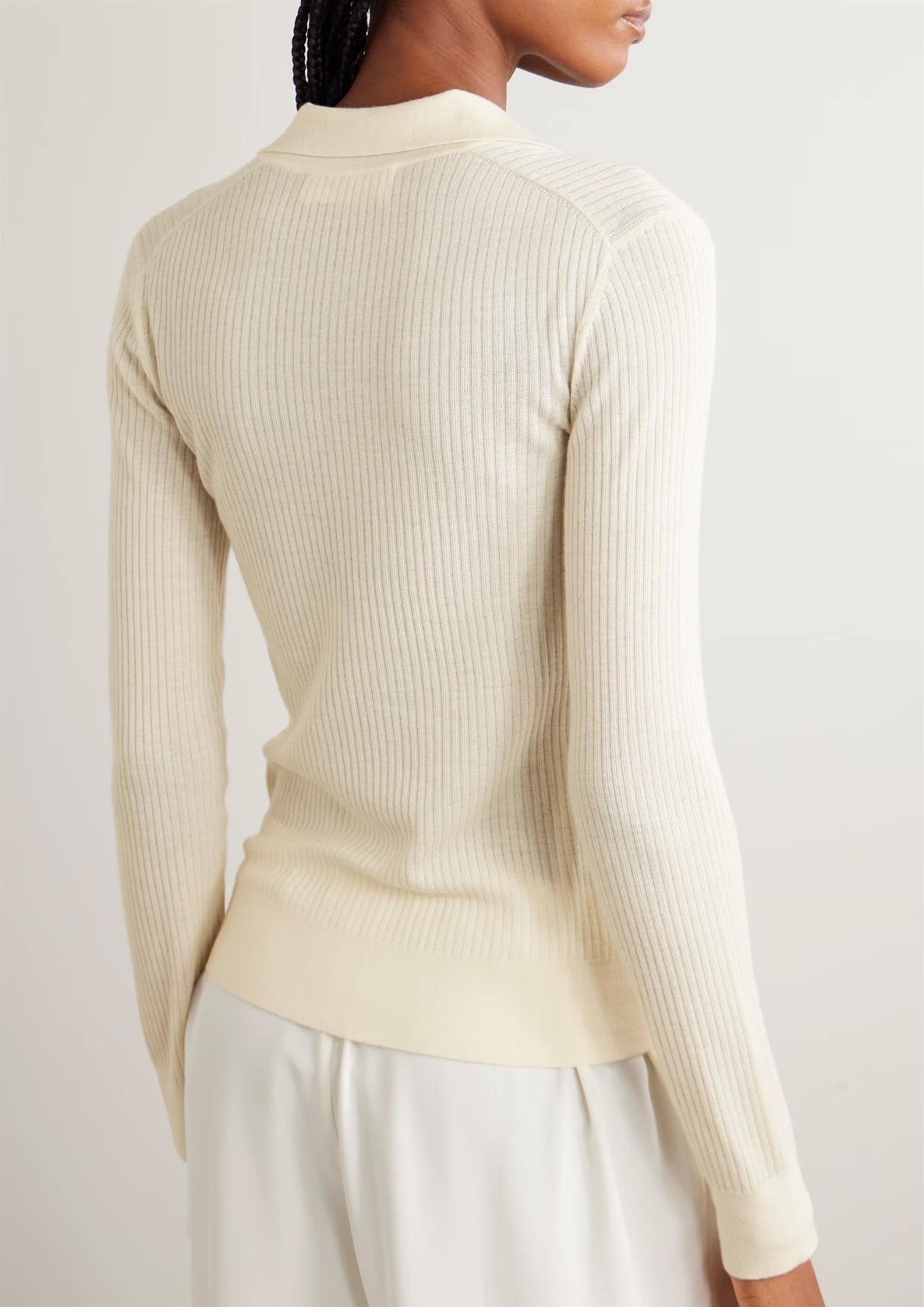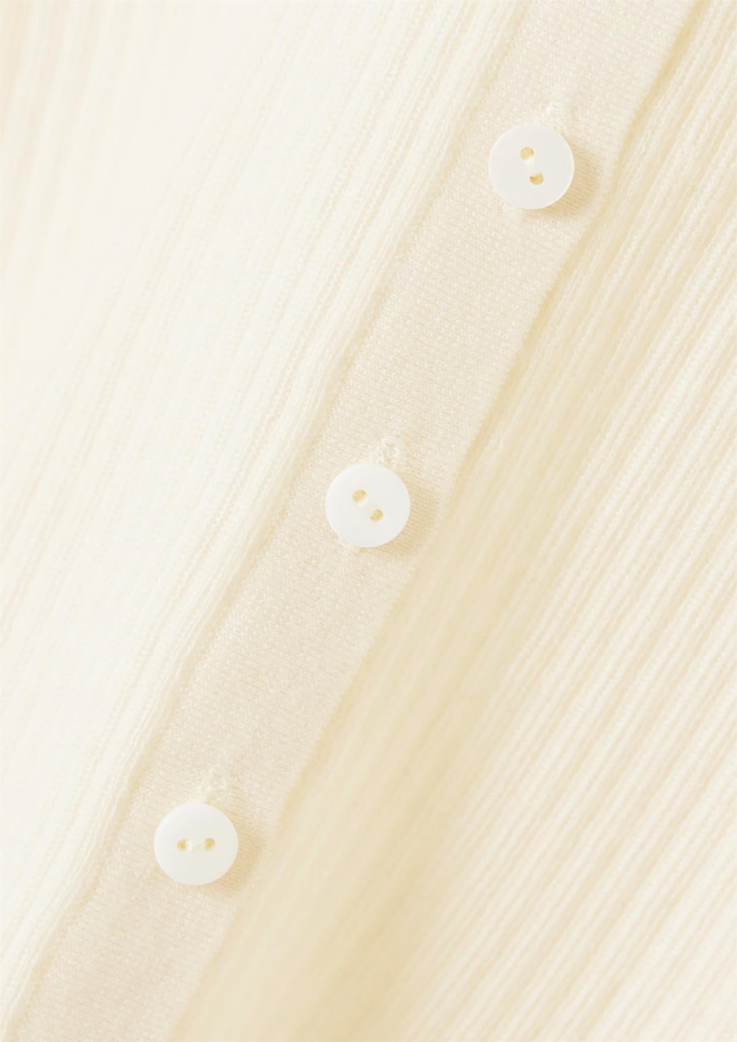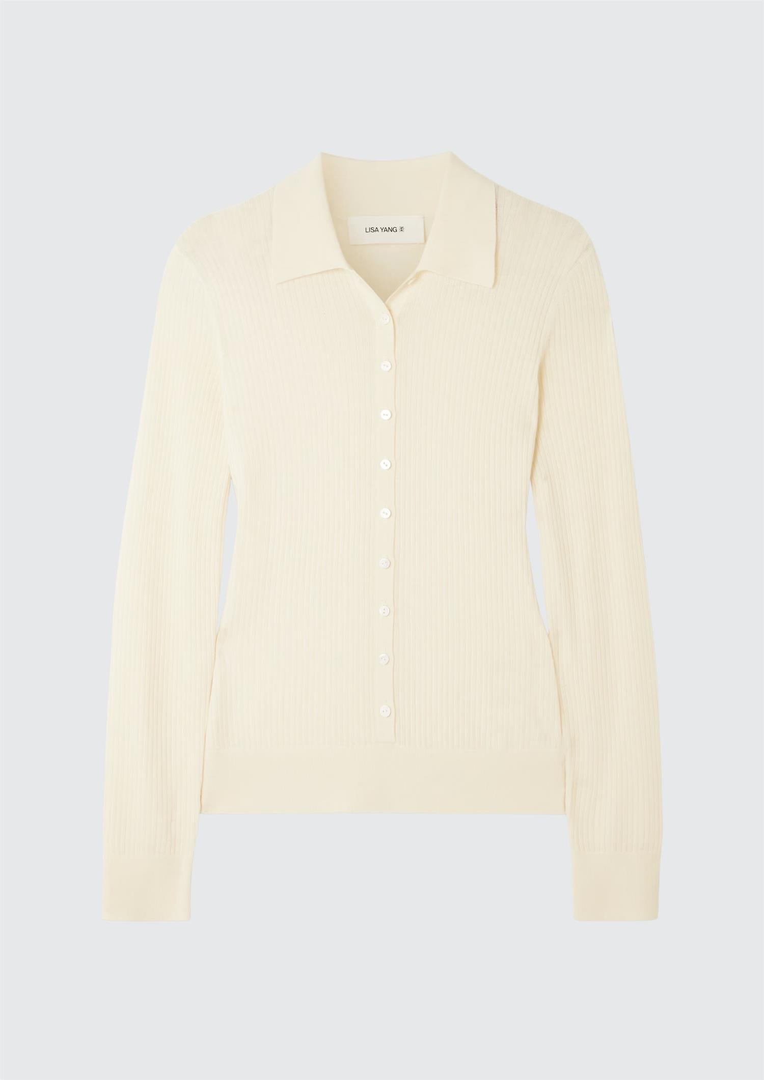 BESKRIVELSE: Agata-cardiganen er en ultra myk og lett genser, laget av ribbet finstrikket kasjmir. Den tettsittende silhuetten har en kragehals med knappestolpe som strekker seg ned til midjen, lange ermer og en ren fald.