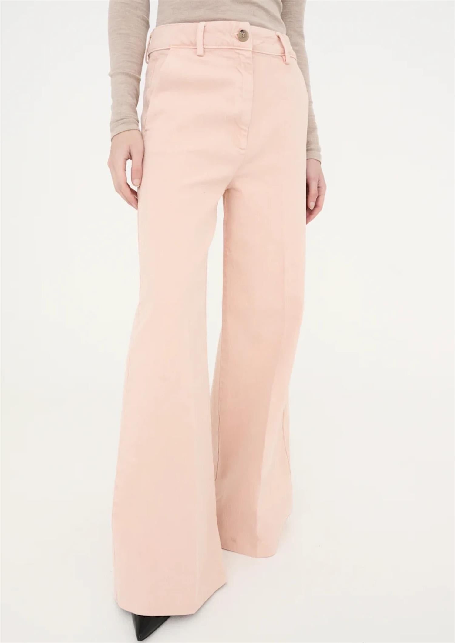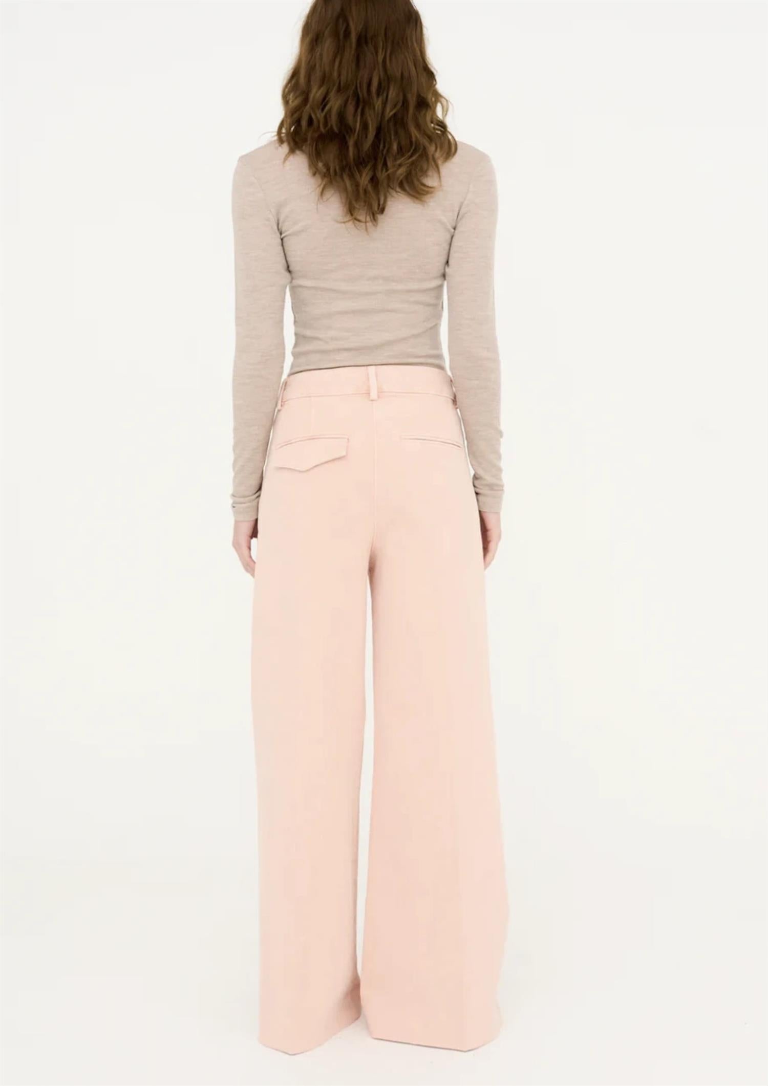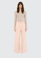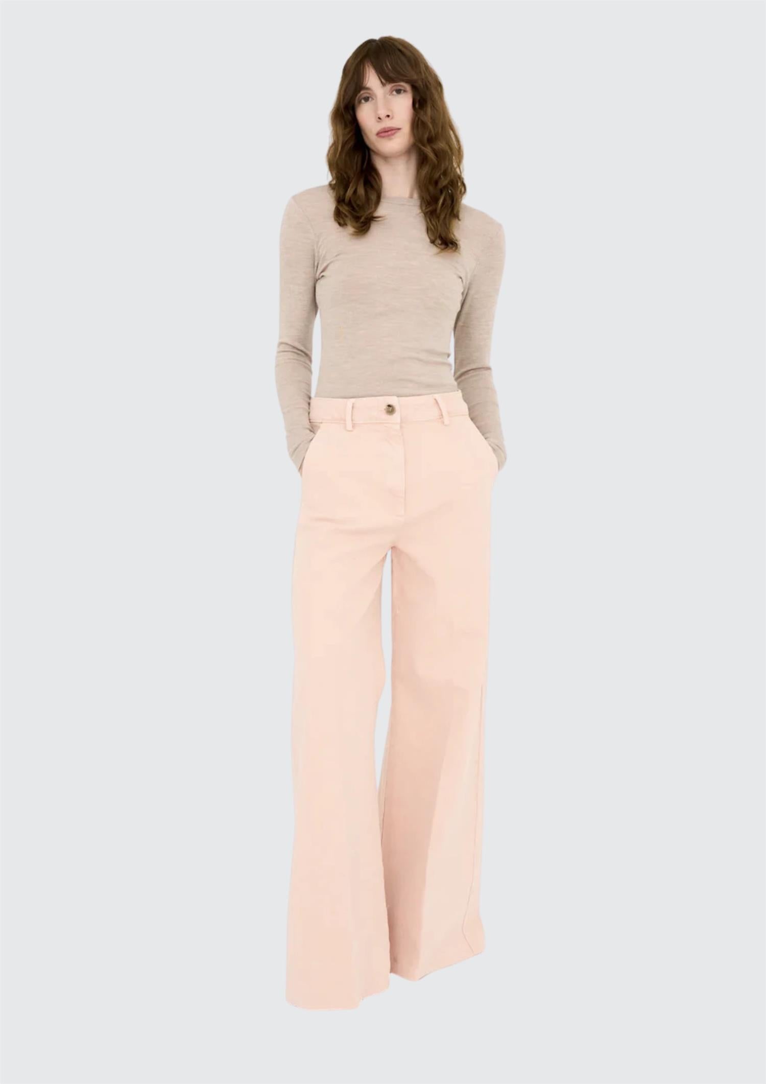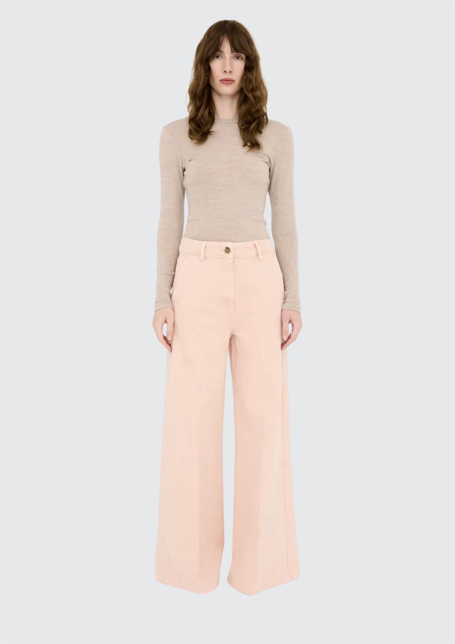 BESKRIVELSE: Ellen er en tidløs klassiker med en subtil, fransk vri. Den høye midjen fremhever silhuetten på en flatterende måte, mens de vide, utsvingte bena gir et elegant og sofistikert uttrykk. Den vaskede, antikk rosa tonen tilfører et mykt og unikt preg som gjør buksen like fin til hverdags som til mer pyntede anledninger.