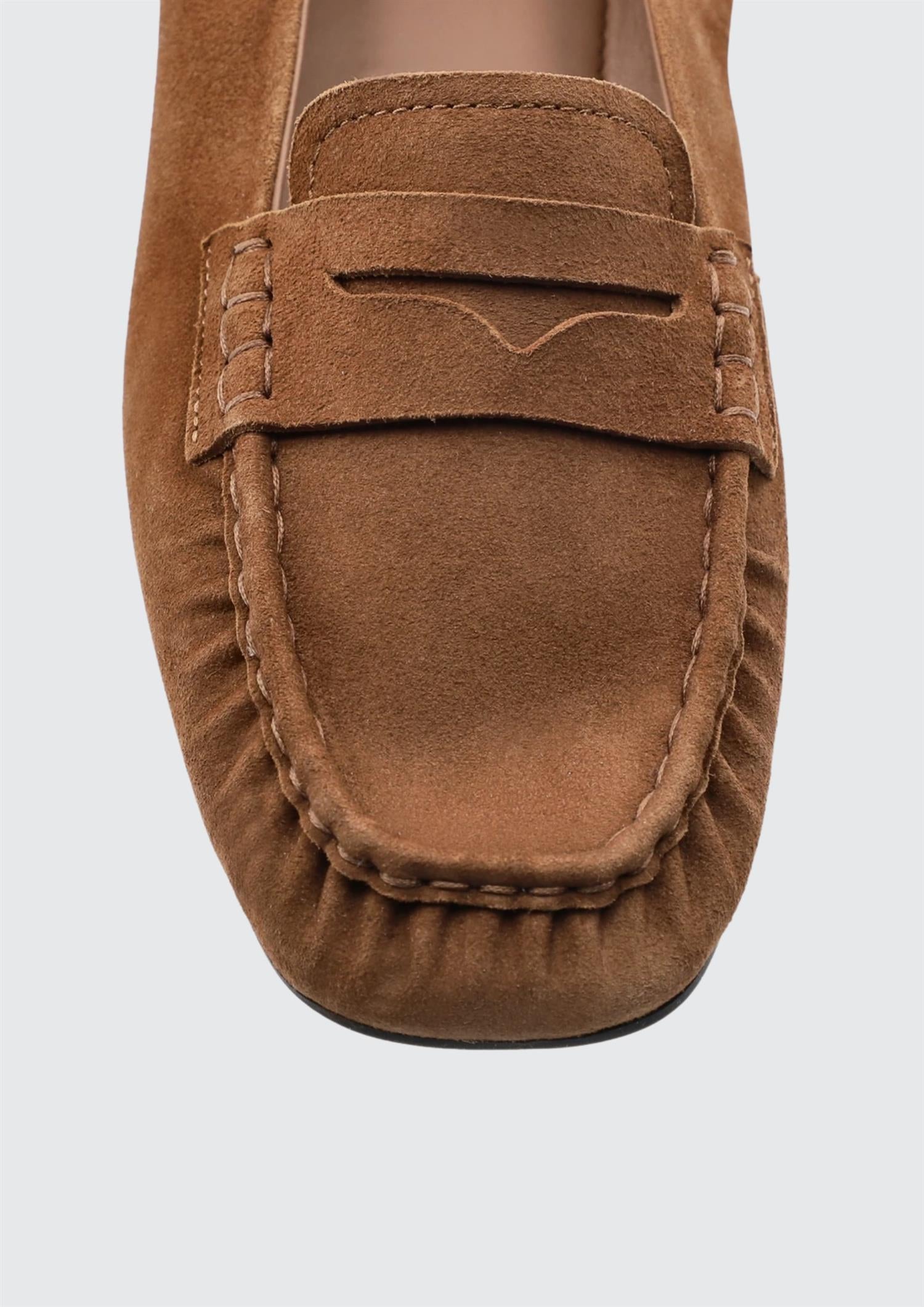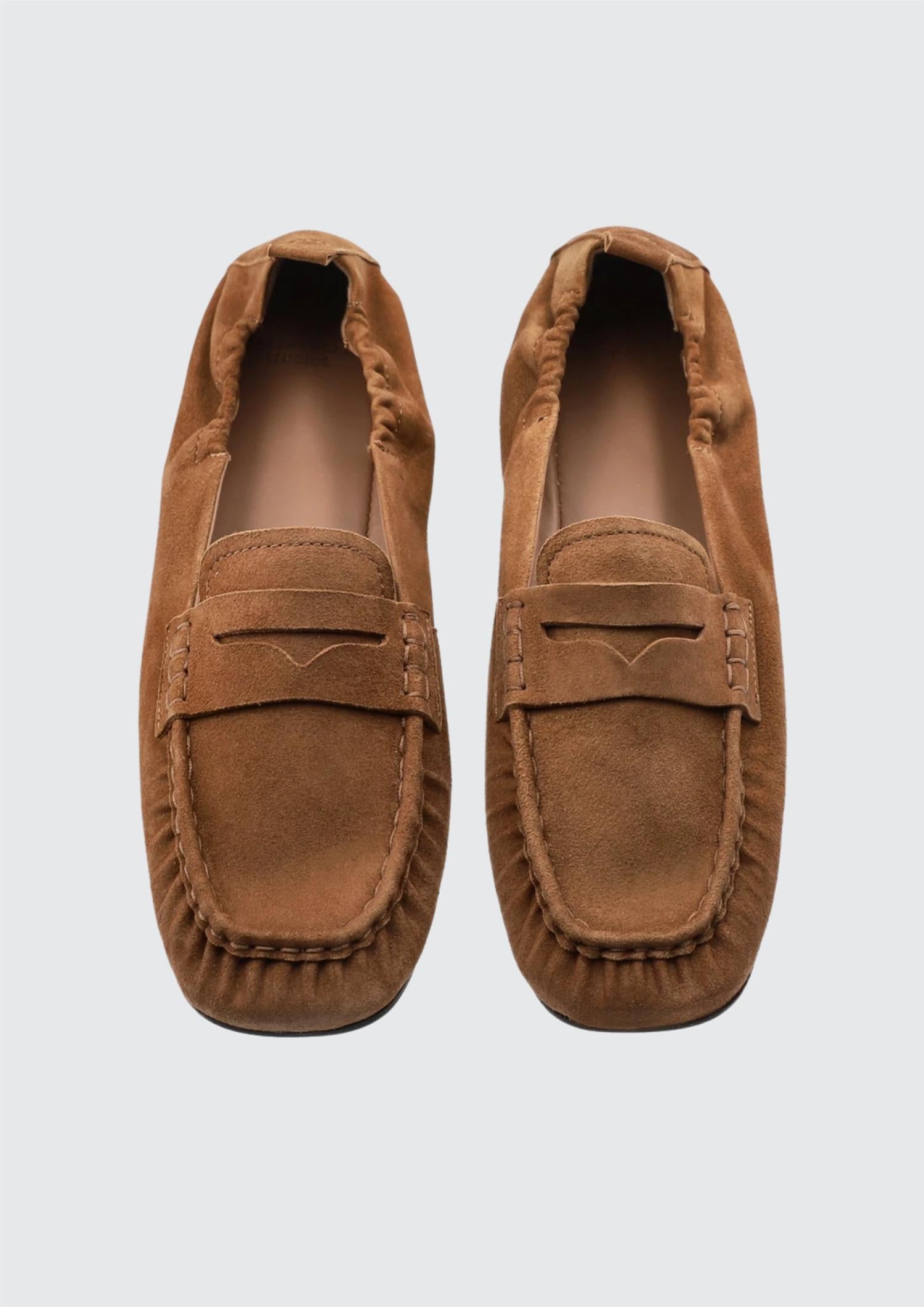 BESKRIVELSE: Myke loafers i semsket skinn med mokkasinfølelse. Den elegante slip-on-silhuetten med elastiske sidepaneler og en diskret trekkflik sikrer komfortabel bruk. Lærdetaljer og subtile rynker i sømmen gir et snev av eleganse. Den litt firkantede tåen og den flate sålen med en subtil blokkhæl fullfører det minimalistiske og stilige designet perfekt.