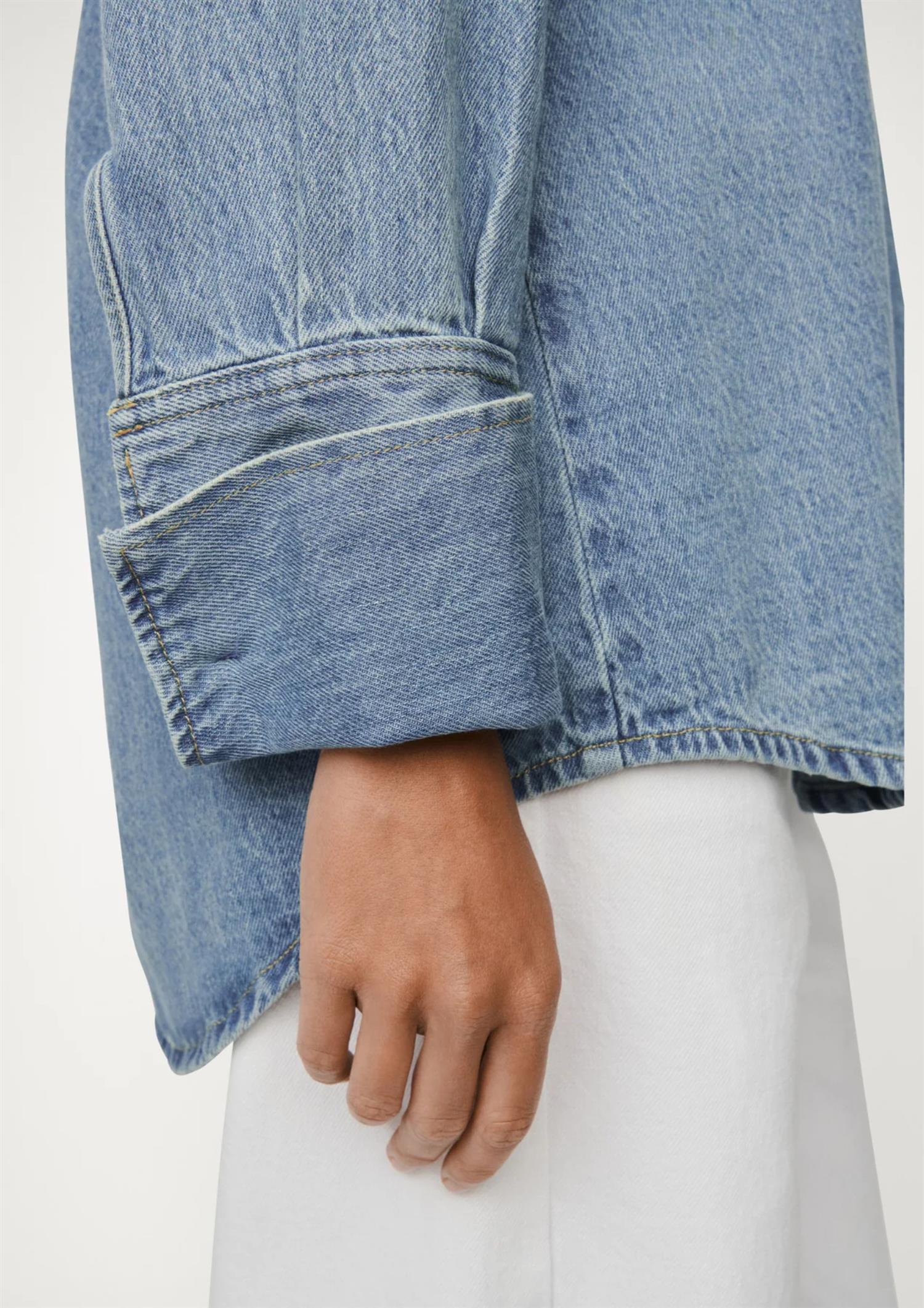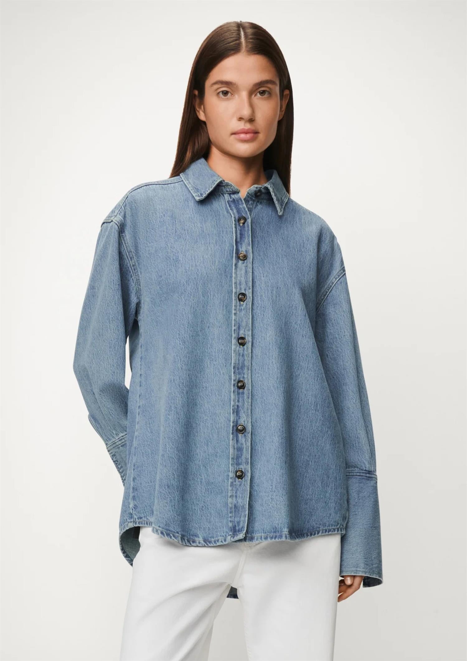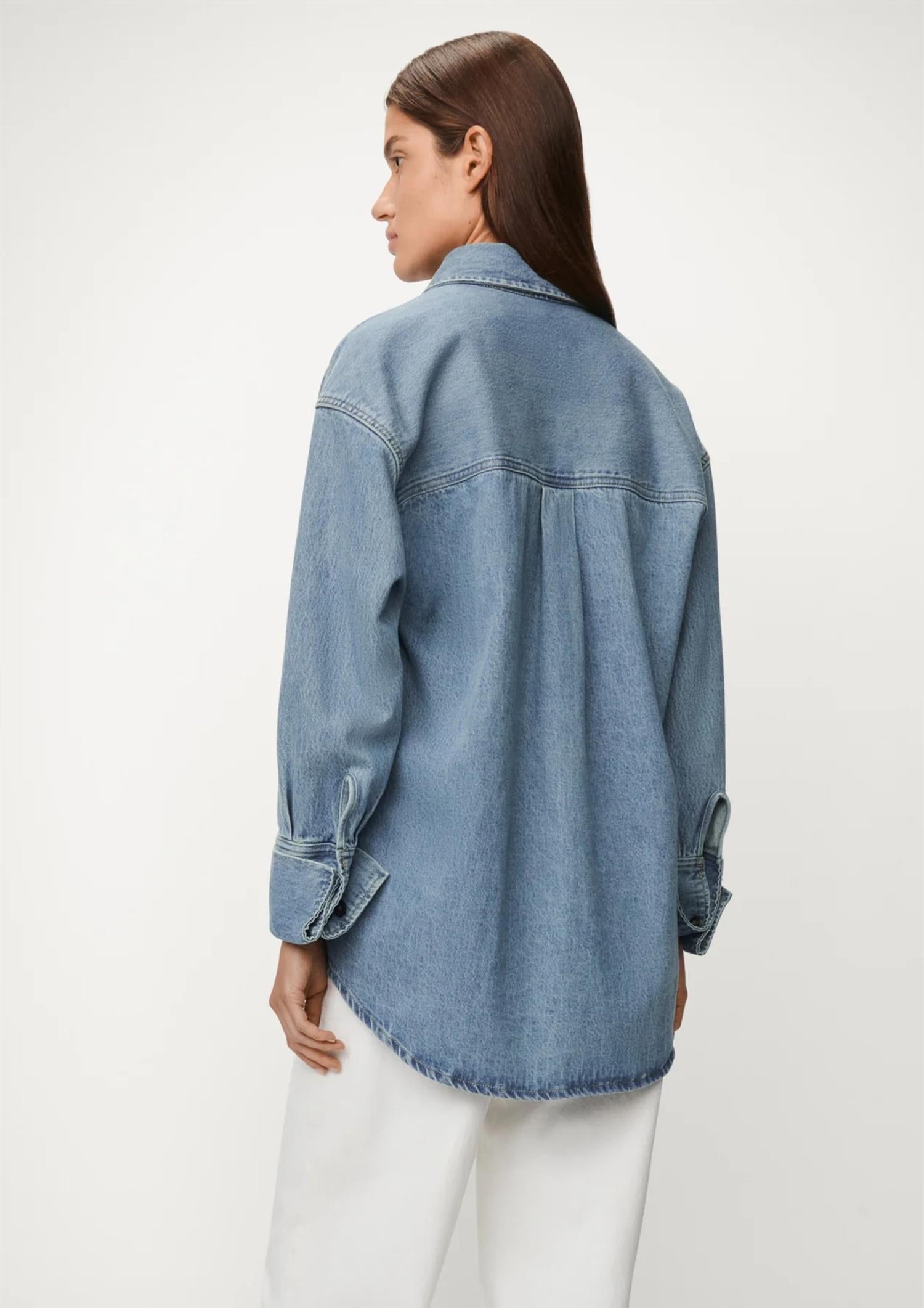 Sydd i stiv, vevd denim uten stretch som gir en autentisk og robust følelse. Spiss krage, knappelukking og brede mansjetter fullfører den tidløse looken. Perfekt som overskjorte eller stylet med jeans for en helhetlig denimstil.