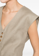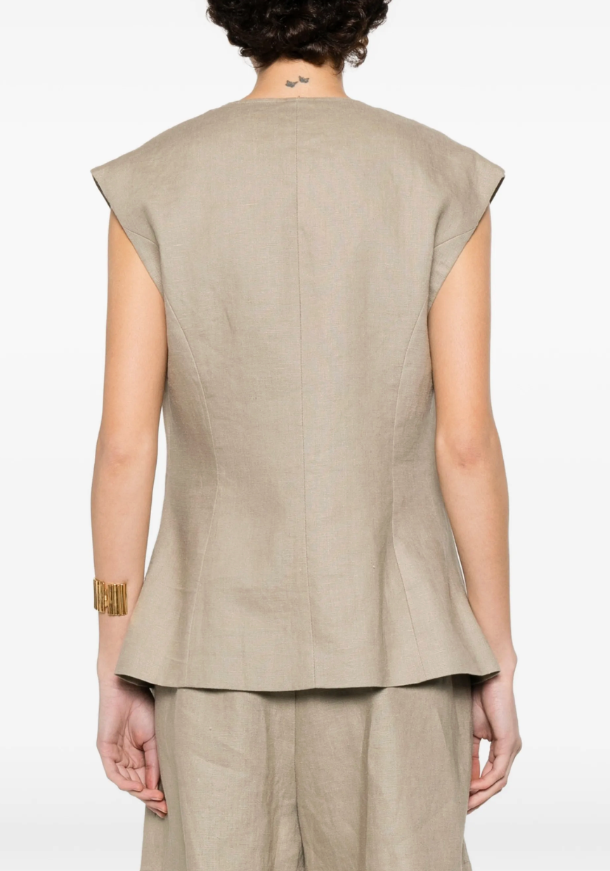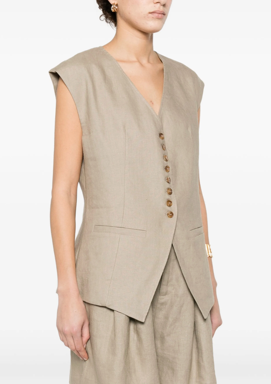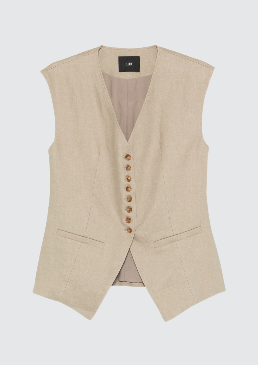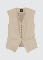 BESKRIVELSE: Eleh Button Linen Waistcoat er en elegant vest i en nøytral fargetone med v-utringning og figurnær passform. Den har en klassisk knappelukking foran og dekorative frontlommer med klaffer. Vesten er laget med et fôrmateriale i lin av høy kvalitet.
