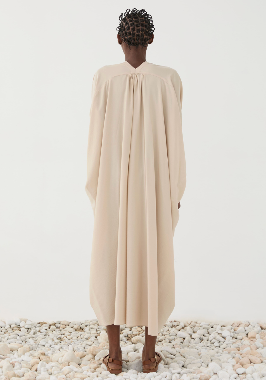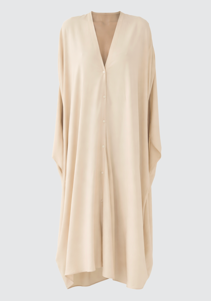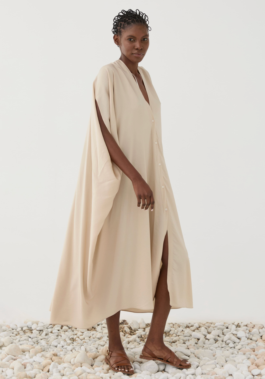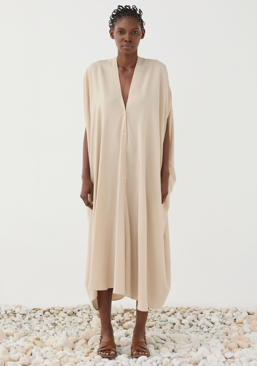 BESKRIVELSE: Fluid Midi Dress er en elegant og tidløs midi-kjole med en lett, flytende silhuett. Kjolen har V-utringning, knapper i front og et mykt fall som beveger seg vakkert med kroppen. Den nøytrale beige fargen gjør den enkel å style både til hverdags og mer pyntede anledninger.