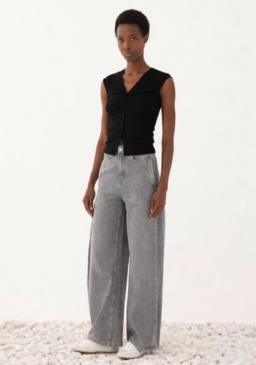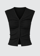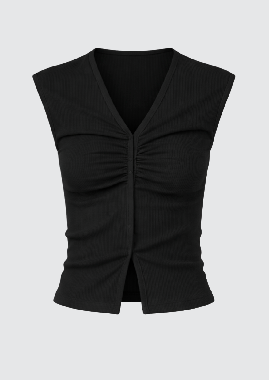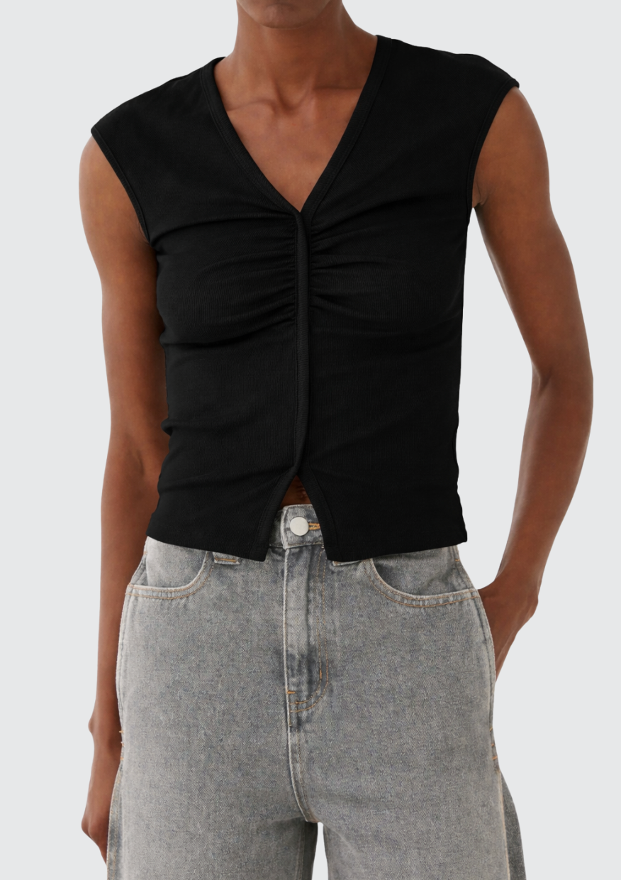 BESKRIVELSE: Topp fra Eleh er en feminin og moderne singlet med en flatterende, kroppsnær passform. Toppen har V-utringning og rynkedetalj i front som skaper en myk, drapert effekt og gir et elegant uttrykk. Den ribbestrikkede kvaliteten gir struktur samtidig som den føles komfortabel mot huden.