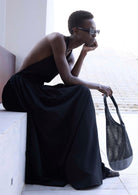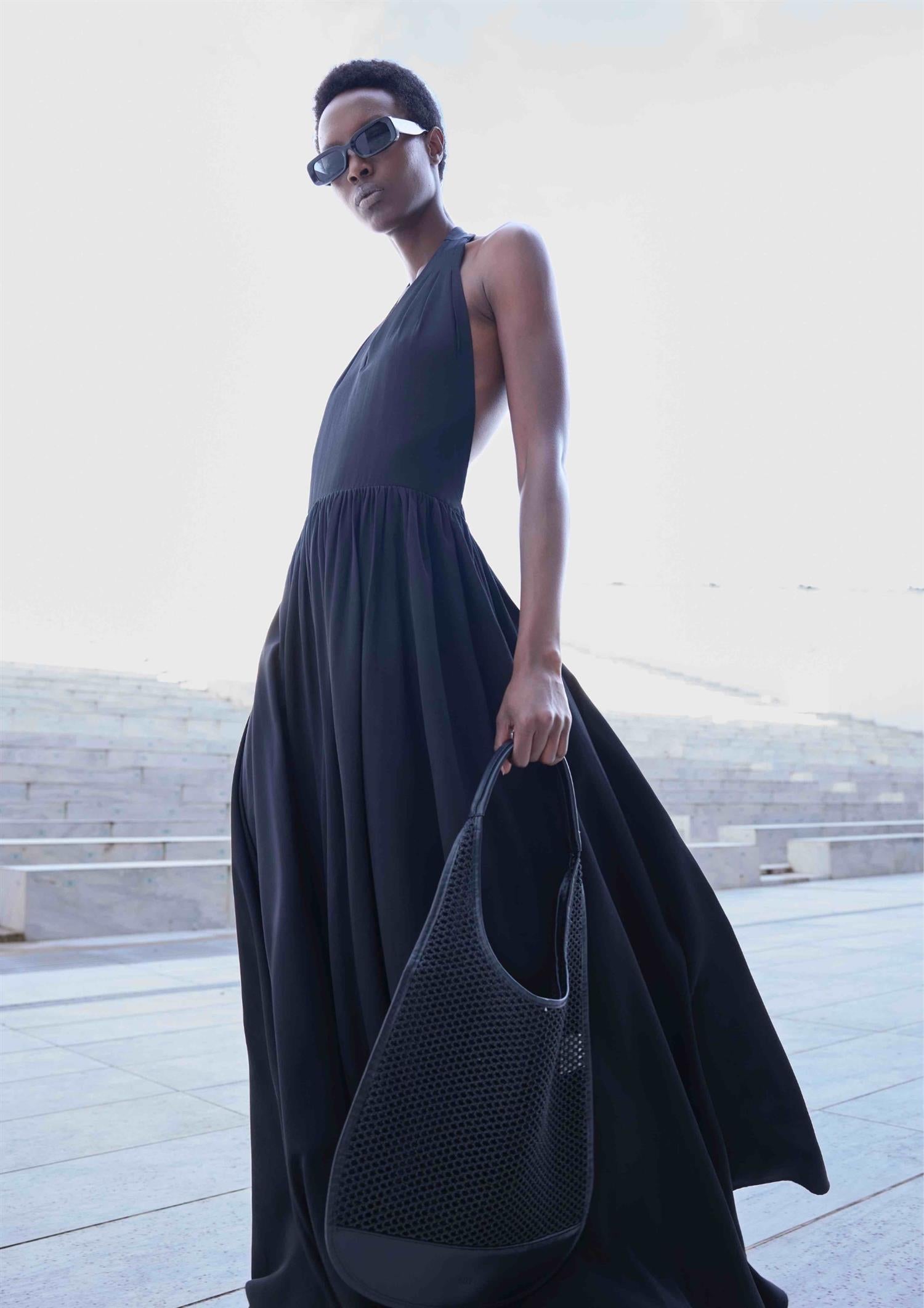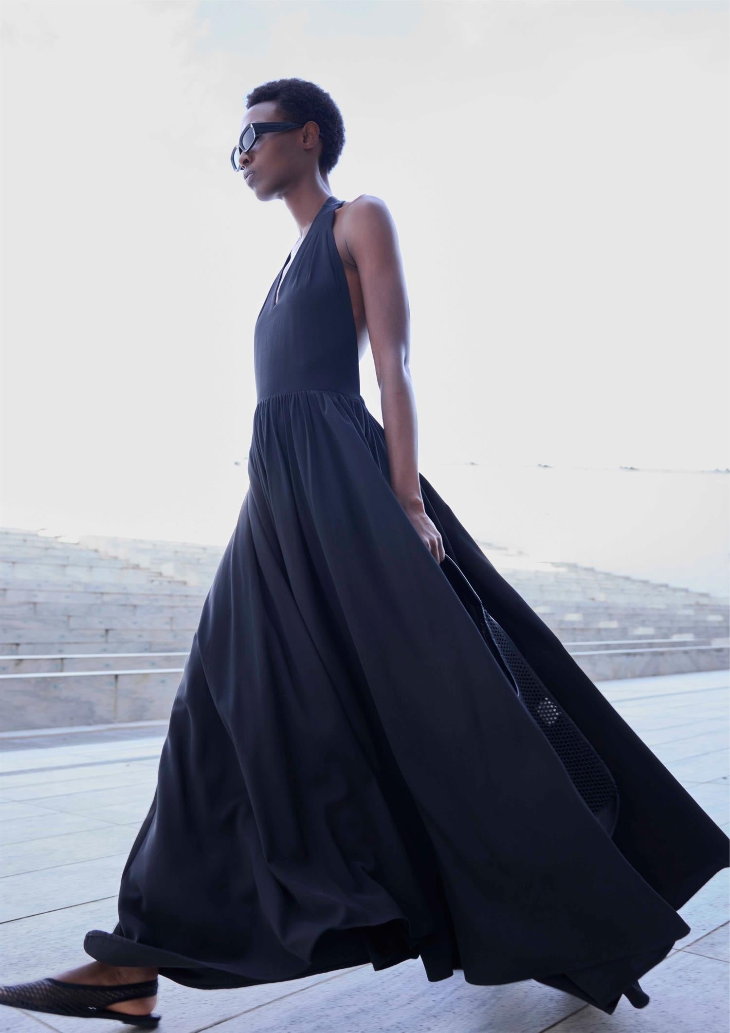 BESKRIVELSE: Maxikjole med halterneck og åpen rygg som gir et rent og moderne uttrykk. Overdelen sitter tett, før kjolen faller fra midjen i et langt, vidt skjørt med mye bevegelse.