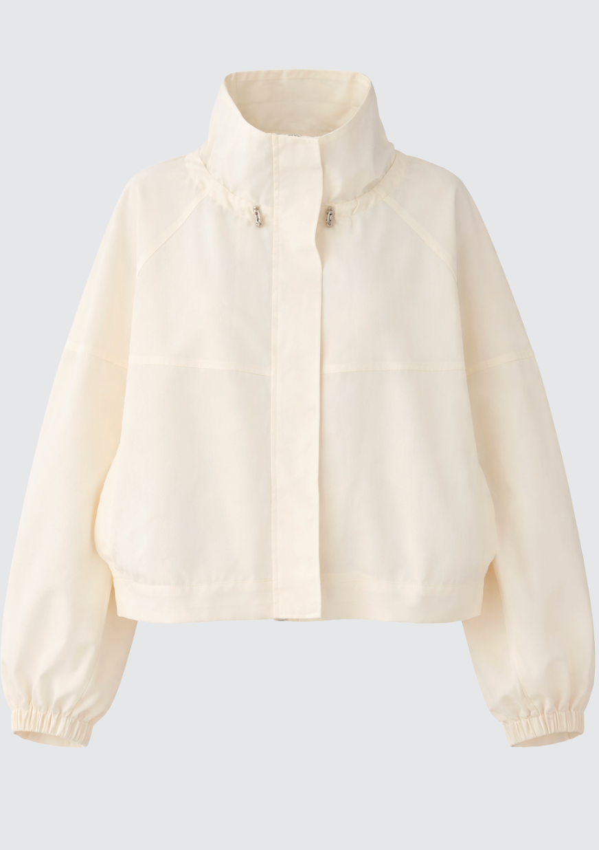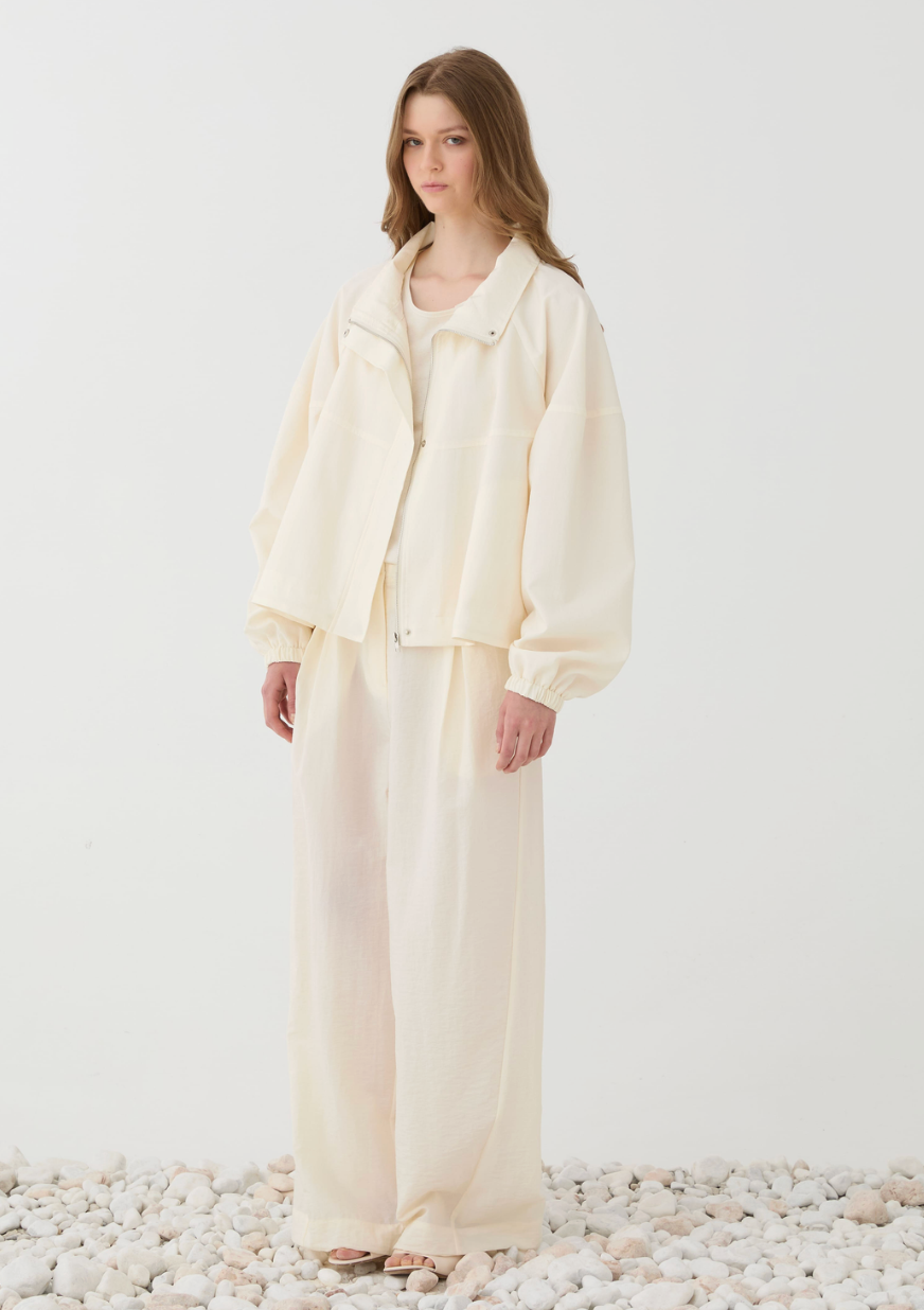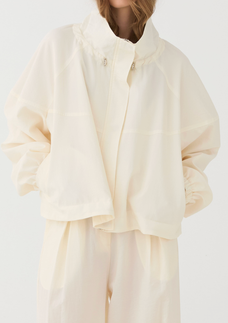 BESKRIVELSE: En lett og elegant jakke med en avslappet, moderne silhuett. Den har en myk, kremfarget tone som gir et rent og sofistikert uttrykk, samtidig som den romslige passformen gjør den behagelig å bruke gjennom hele dagen. Den høye kragen og de vide ermene tilfører et stilrent, skandinavisk preg, mens det lette materialet gjør den perfekt som et ekstra lag over både hverdagsantrekk og mer pyntede looks.