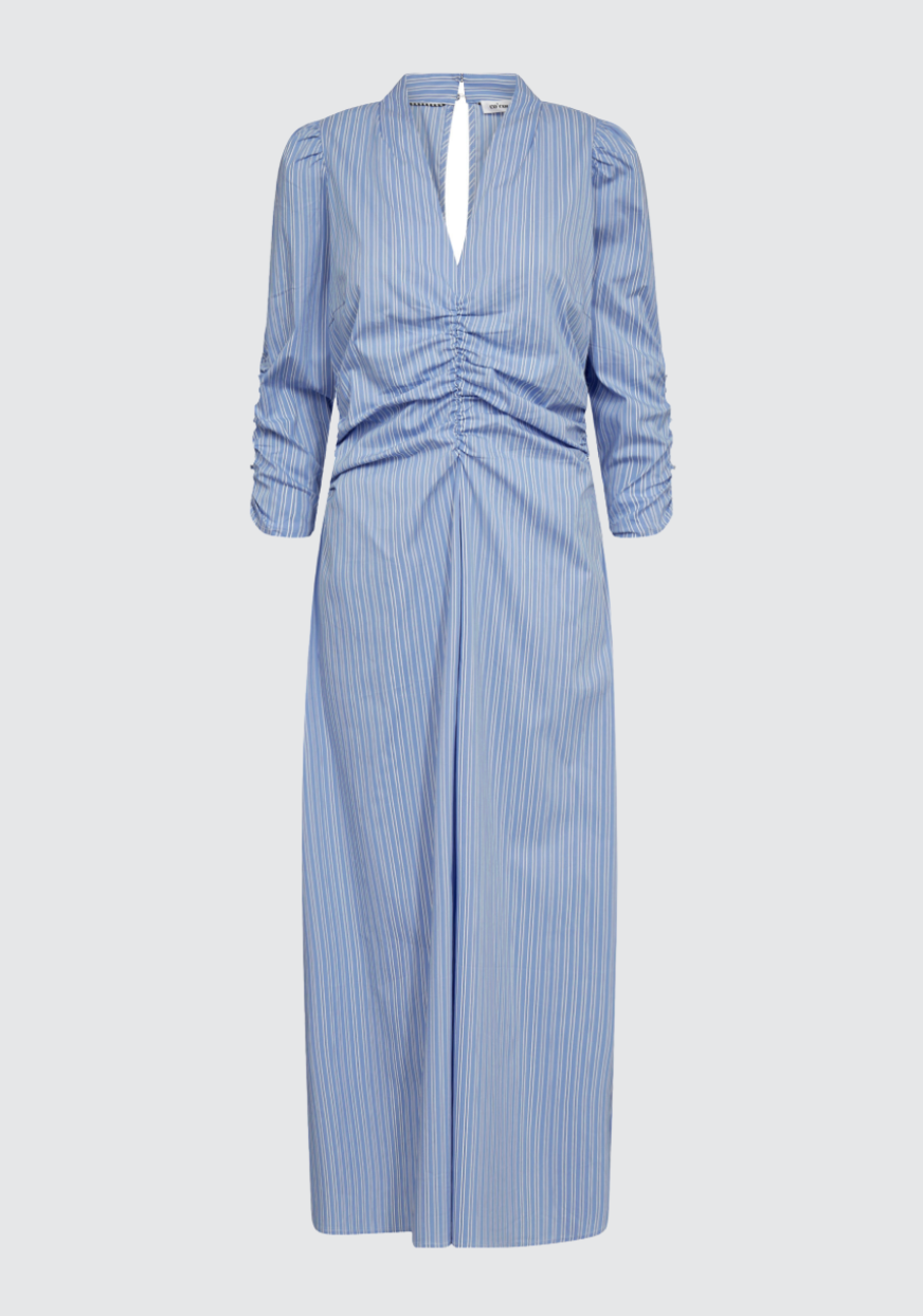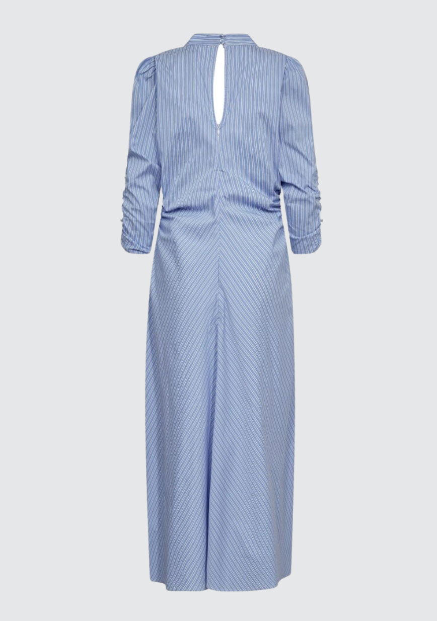 BESKRIVELSE: Stripet kjole fra Co’Couture i en lys blå nyanse med et feminint og moderne uttrykk. Kjolen har dyp V-utringning med rynkedetaljer foran som gir en flatterende passform, samt trekvartlange ermer med lett puffeffekt.