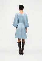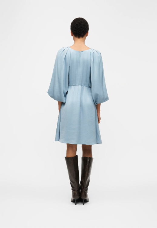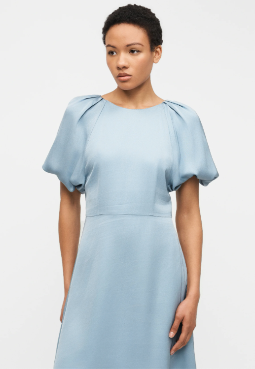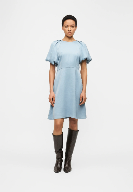 BESKRIVELSE: En lett og feminin kjole sydd i myk viskose som faller pent. Modellen har rund hals, 3/4 voluminøse ballongermer med elastiske mansjetter og delikate legg ved skuldrene. En definert midje og et lett utsvingt miniskjørt skaper en flatterende A-linje, mens den åpne ryggen gir en elegant og moderne vri.