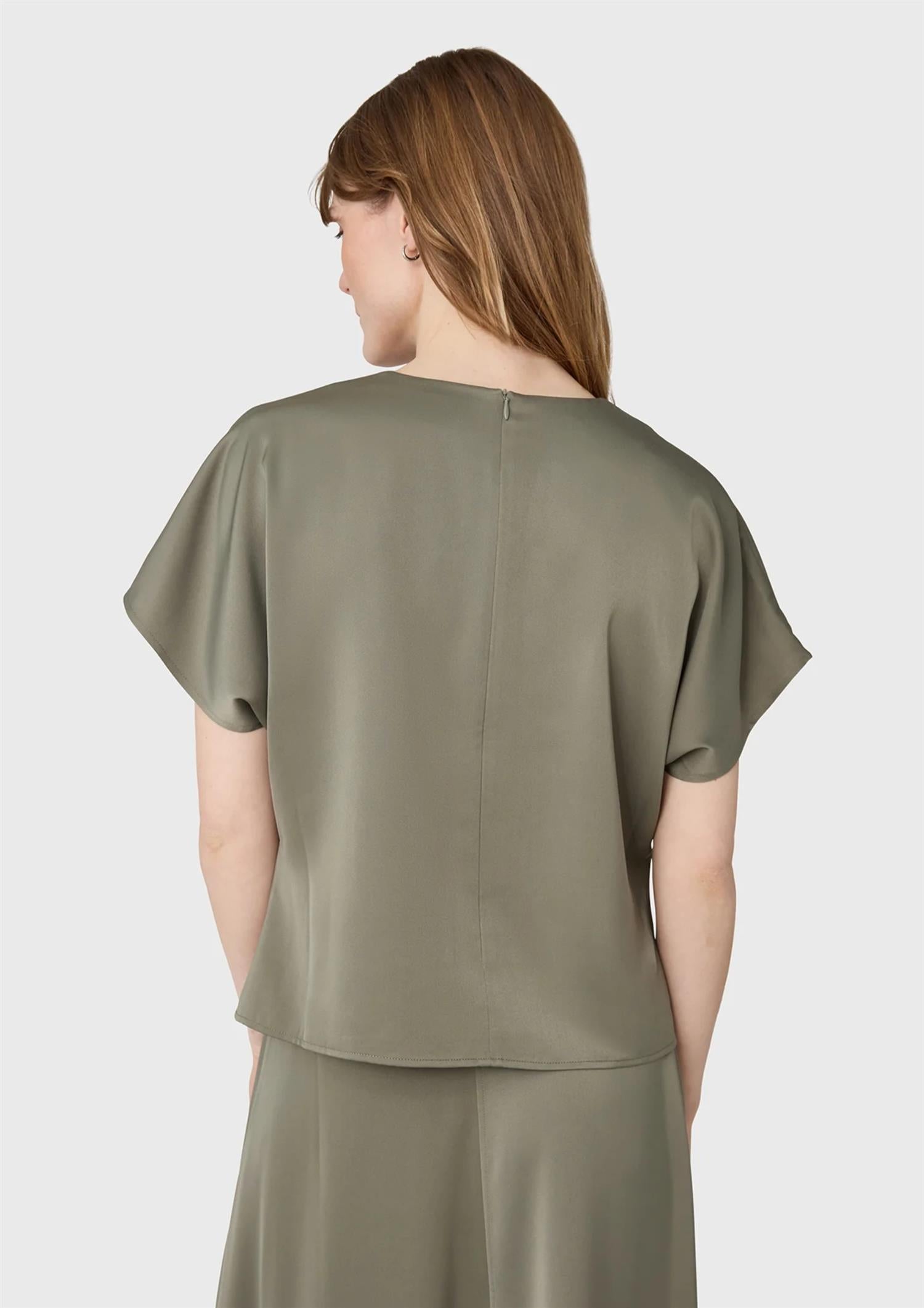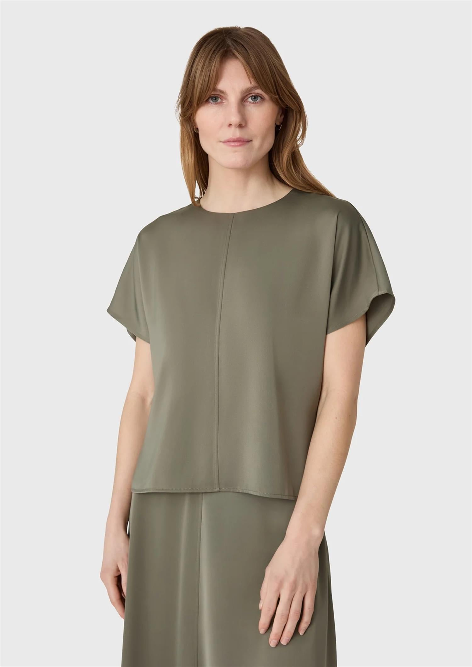 BESKRIVELSE: Mia Satin Top er en elegant og anvendelig topp med korte ermer og rund hals. Den har en lett innsvinget passform som gir en feminin silhuett uten å føles stram. Stoffet er i myk satin med stretch, som gir en behagelig komfort og et eksklusivt, subtilt skinnende uttrykk.