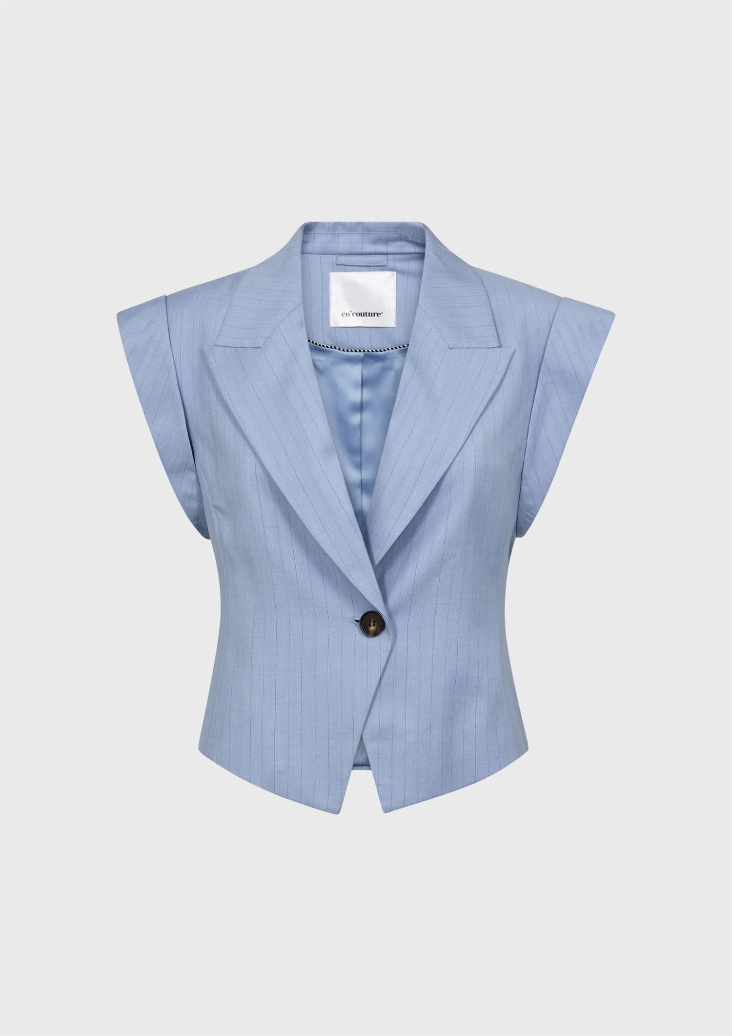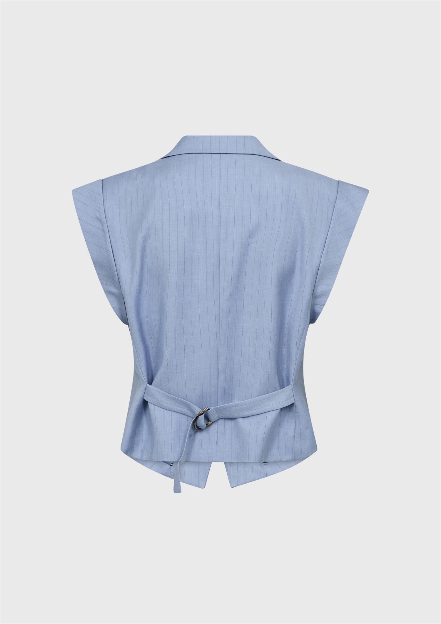 BESKRIVELSE: Vest med brede skuldre, skulderputer og stropp bak. Vesten har slag foran og en enkelt knapp. Den er midjelang med en rett avslutning bak. Bruk den som topp, med en t-skjorte under med jeans, eller med Kiana Bermuda-shorts.